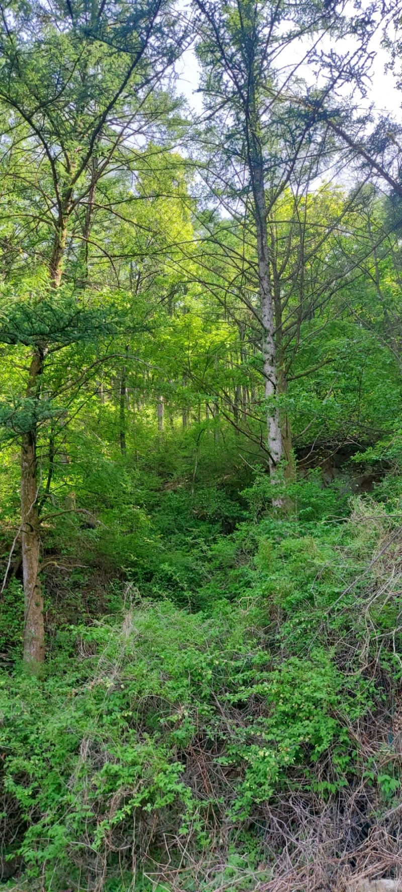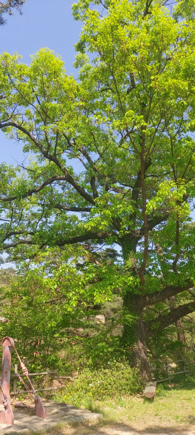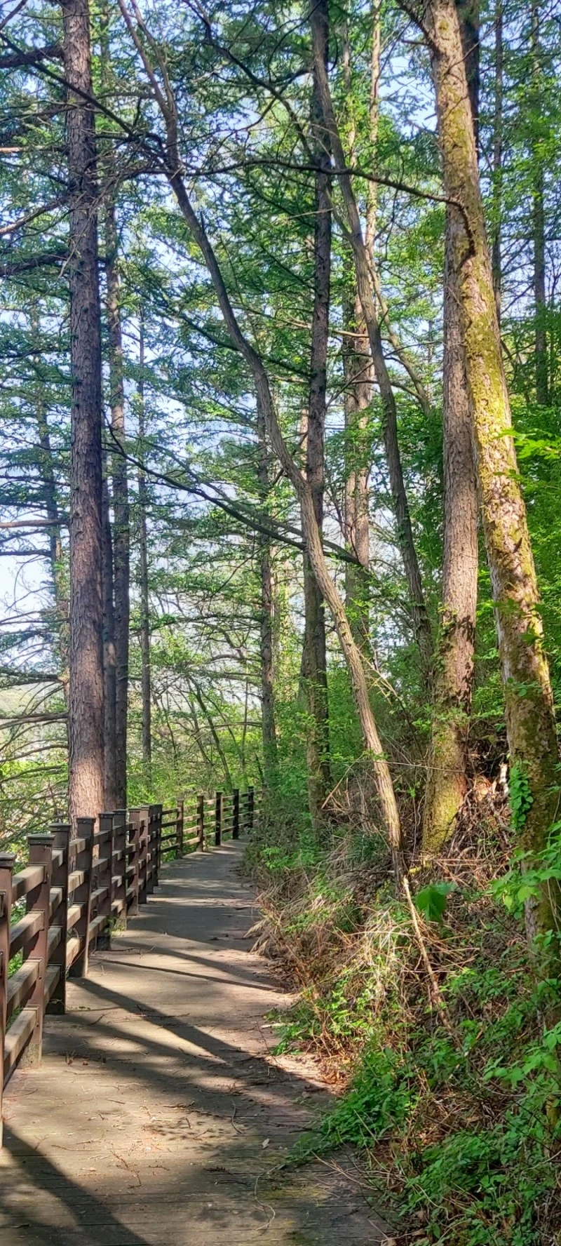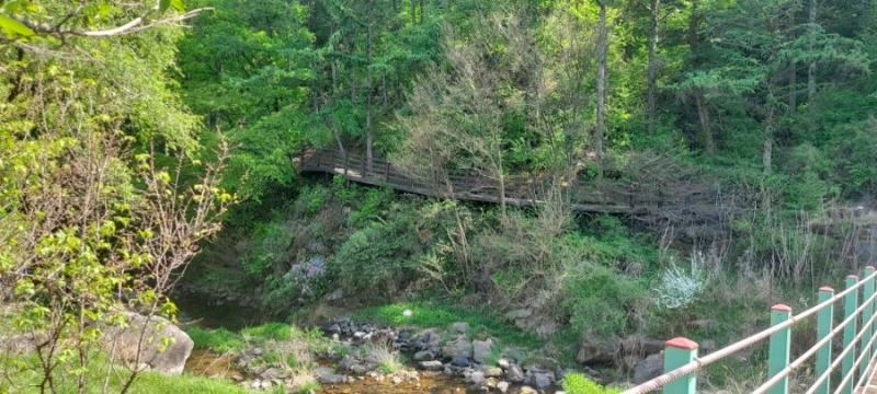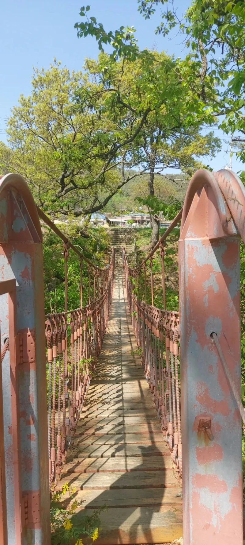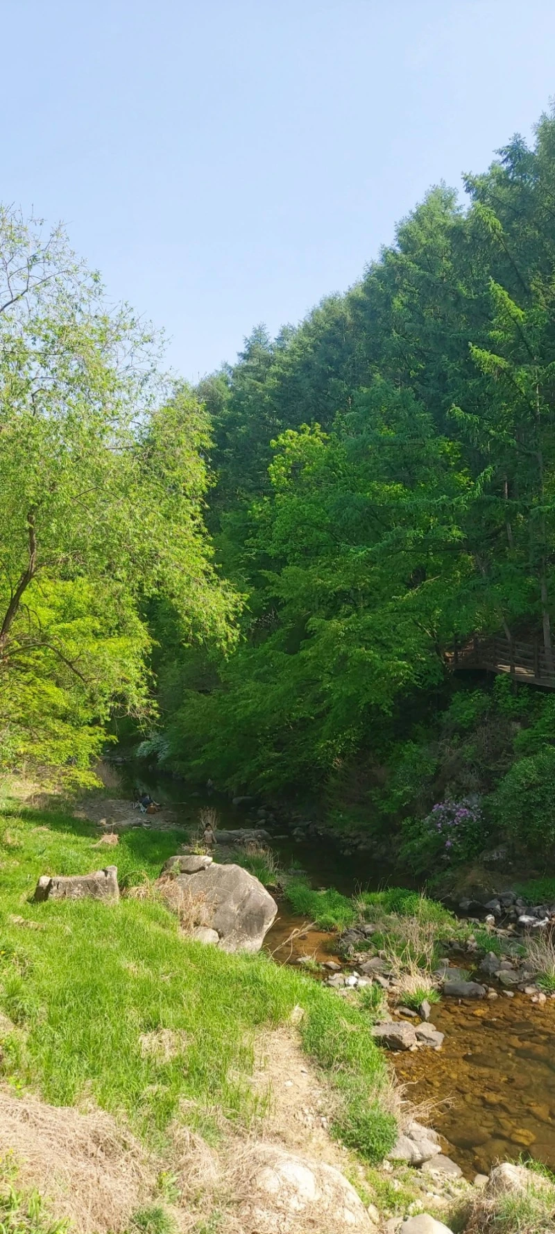 초간정 앞을 흐르는 개울물이 이곳에도 흐르고 있어, 출렁다리 아래에서 벌써 물놀이를 즐기는 가족이 있더라구요. 우린 30m길이의 출렁다리를 건넌 뒤 산을 따라 난 데크길을 걸었어요. 28도까지 올라 봄치곤 제법 더운 날씨였는데 이 길은 그늘이 져서 시원하더라구요. 다양한 초록빛이 가득하고, 보리수꽃향기가 가득한 숲길을 호젓하니 걸을 수 있어 참 좋았어요.