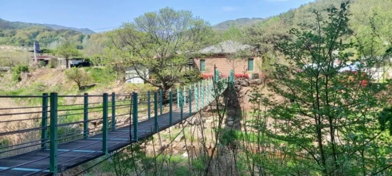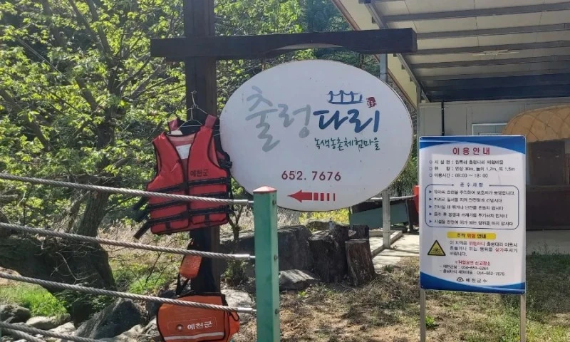 보건소 뒤편으로 200m쯤 뒤 용문사 방향으로 가다보면 왼쪽에 출렁다리 팜스테이가 보여요. 오미자가 한창 자라고 있는 밭옆에 자리한 출렁다리 팜스테이 안으로 들어가면 주차장이 마련되어 있고, 건물 뒤편에 출렁다리가 있어요. 이곳은 마을 전체를 '출렁다리마을'이라고 부른답니다. (주소 : 경상북도 예천군 용문면 용문경천로 826)