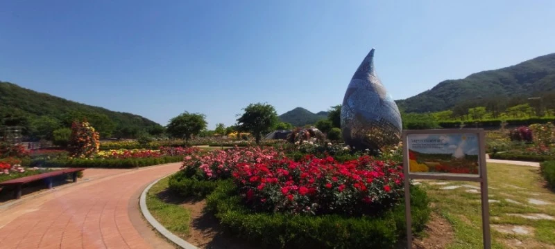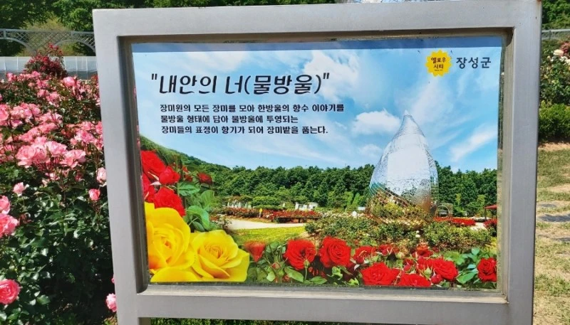 장미공원 중심부에는 "내안의 너(물방울)"라는 상징물이 있어요. 장미원의 모든 장미를 모아 한방울의 향수 이야기를 물방울 형태에 담아 물방울에 투영되는 장미들의 표정이 향기가 되어 장미밭을 품는다는 의미를 지녔답니다.