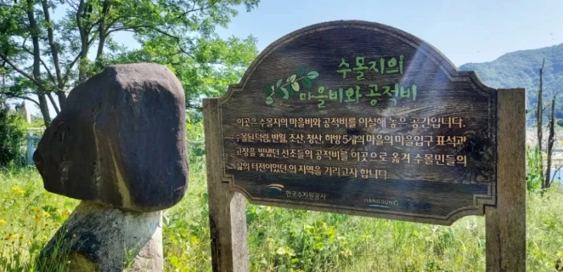 장미정원 주차장에서 나와 댐 전망대에도 가봤는데요, 그곳에서는 평림호의 잔잔한 호수 풍경과 함께 수몰지의 마을비와 공적비를 옮겨놓은 공간을 발견했어요. 평림댐 건설 당시 수몰된 덕림, 반월, 조산, 청산, 하방 5개의 마을의 마을입구 표석과 고장을 빛냈던 선조들의 공적비를 이곳으로 옮겨 수몰민들의 삶의 터전이었던 이 지역을 기리기 위해서라고 해요. 사람들이 거의 찾지 않는 곳이지만 호수를 내려다볼 수 있는 풍경이 좋으니 꼭 들러보세요~