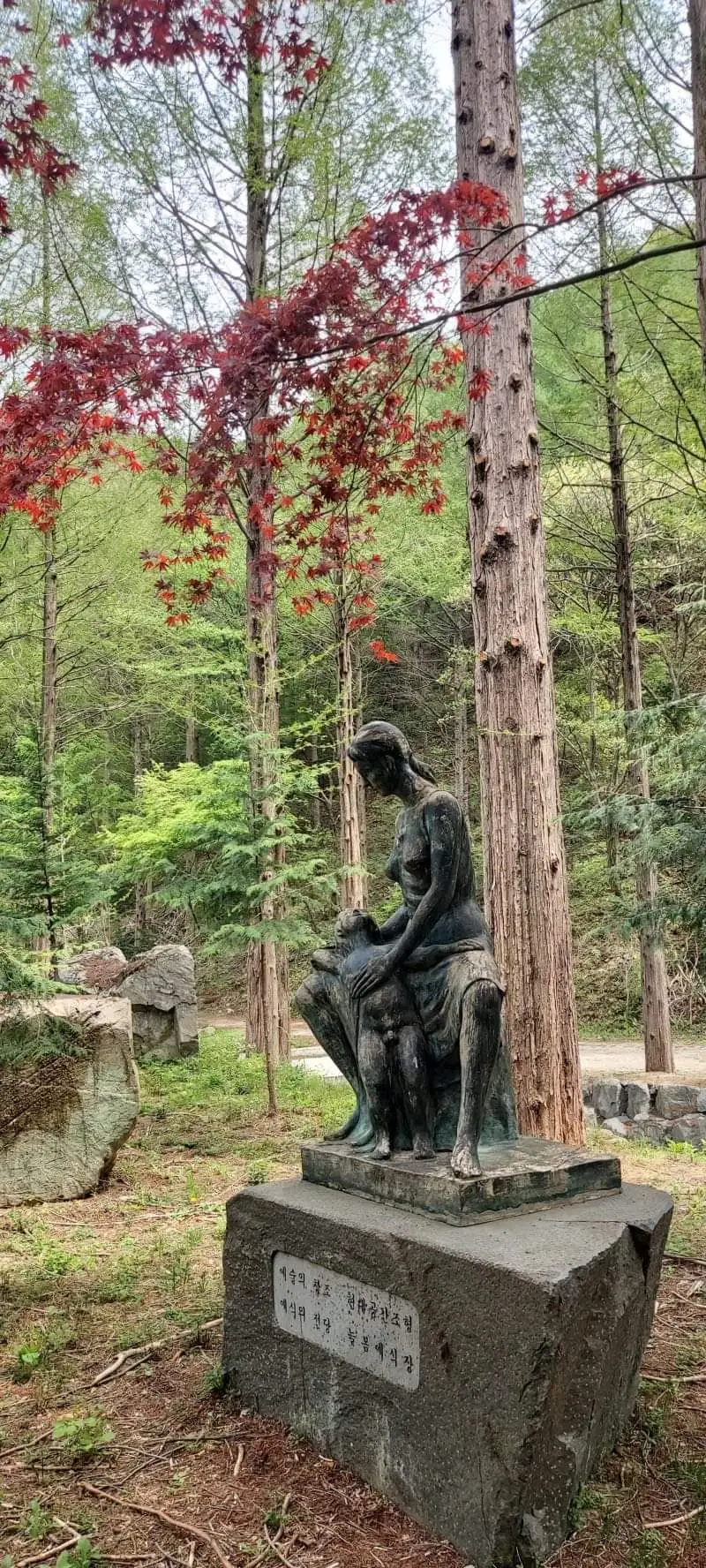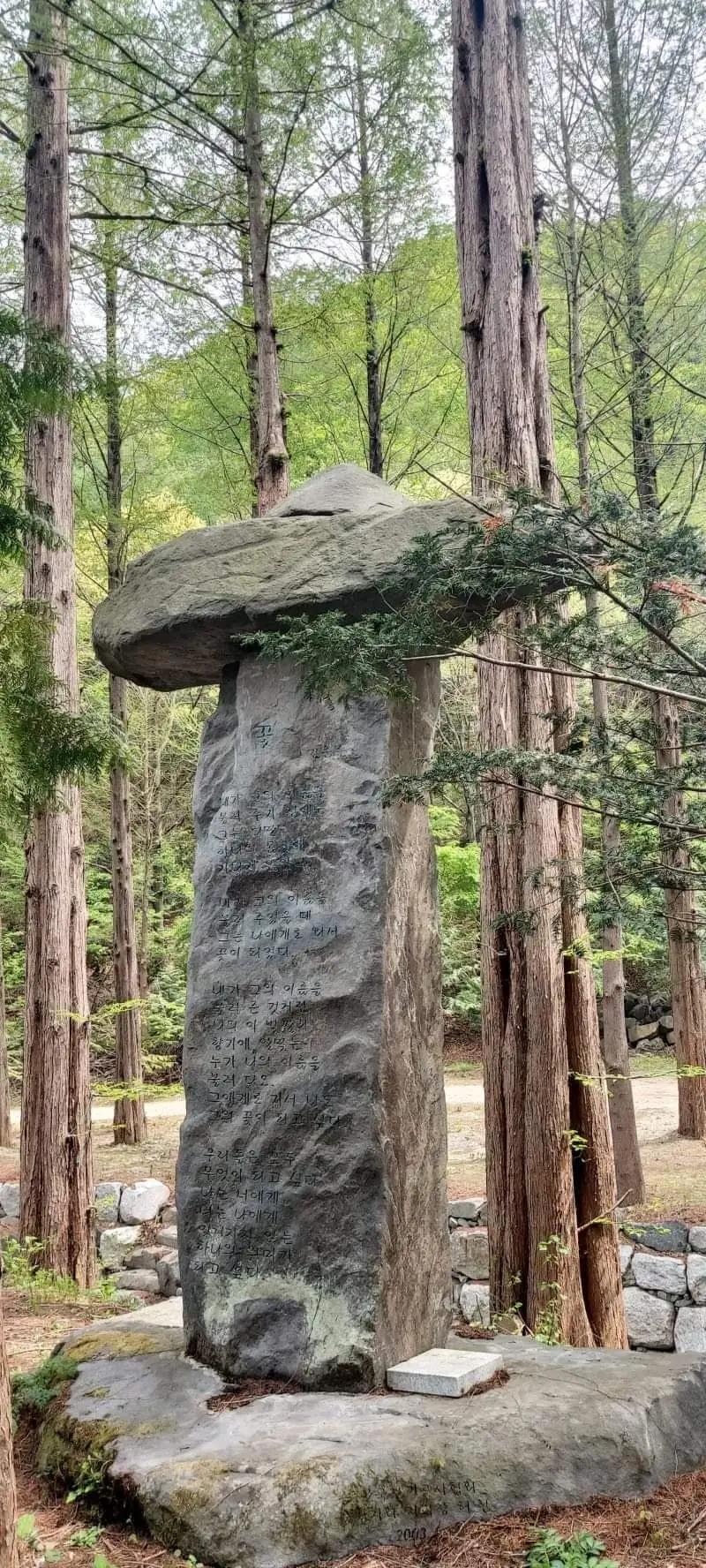 온빛자연휴양림 쥔장은 시를 좋아하시나 봐요. 주차장 주변을 둘러싼 메타세콰이어 나무엔 판넬에 예쁜 배경그림에 시를 써서 달아놓았고, 휴양림 안쪽의 공원에는 돌로 만들어진 시비도 죽 늘어서 있더라구요. 호수 주변으로 산책을 즐길 수 있도록 산책로도 잘 조성되어 있고, 시비가 있는 공원엔 너른 초록 잔디밭 주위로 조각작품과 미끄럼틀이 마련되어 있어서 소풍을 즐기기에도 좋은 곳이랍니다. 호수로 들어오는 물줄기를 따라 위쪽으로 올라가면 뜬금없이 공룡이 나와서 반겨주기도 하구요. 작은 개울을 따라난 오솔길을 따라서 휴양림의 초록초록을 즐기다보면 아주 귀여운 다람쥐도 만날 수 있어요. 맨 위엔 작은 사방댐과 약수터가 마련되어 있답니다.