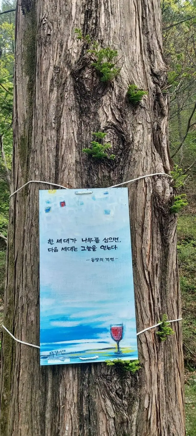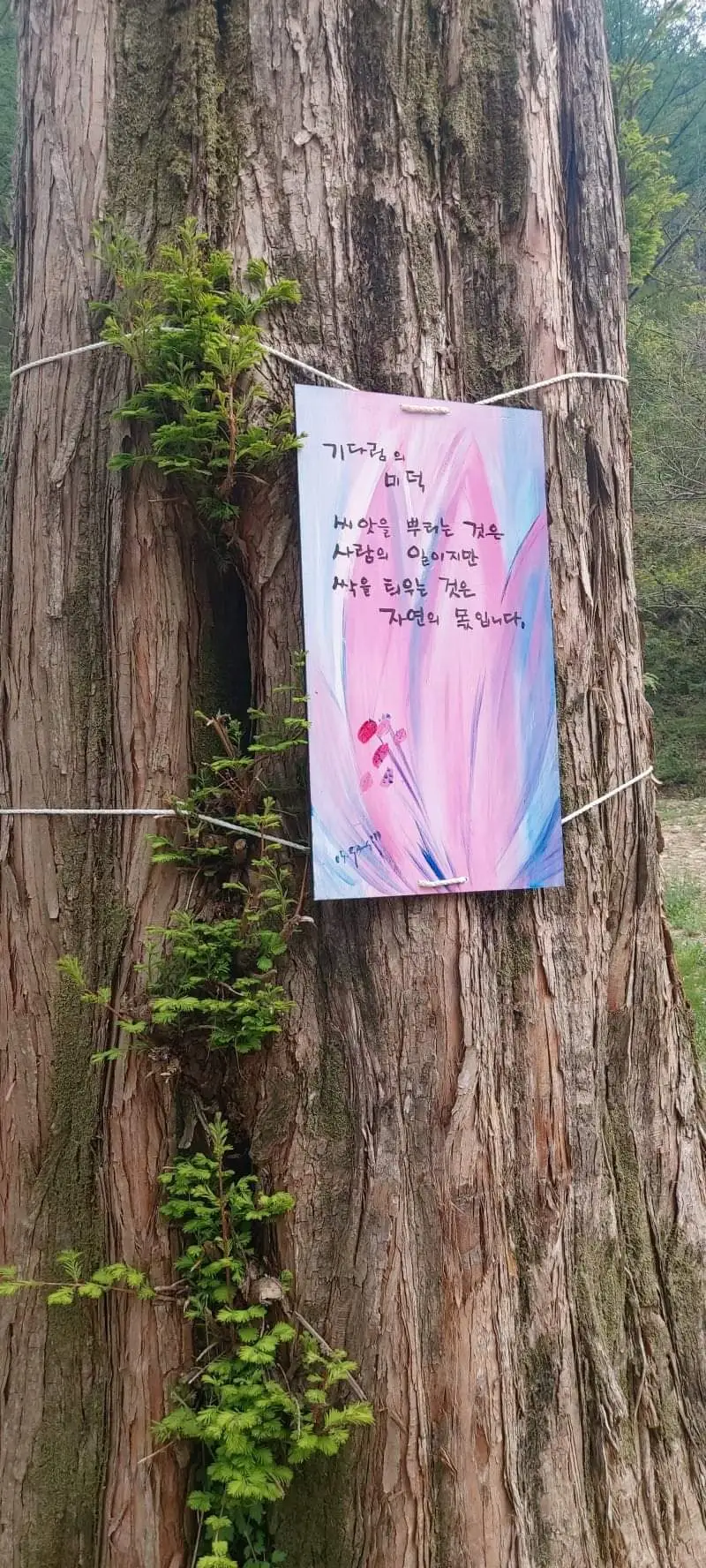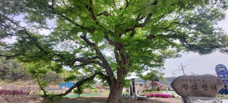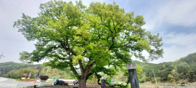 논산 온빛자연휴양림은 한삼천리 안에 있는데요, 마을 입구 버스승강장 옆의 400년 수령의 느티나무도 아주 멋지답니다.