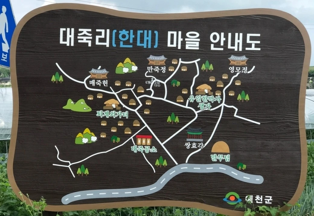 이 말무덤의 효험이 얼마나 큰지, 말무덤을 몇 해째 찾아왔으나 한 번도 이 동네 사람의 말소리를 들은 적이 없다. 정말 조용한 동네이다. 대죽리는 '한대마을'이라고도 부르는데, 마을지도를 보니 매죽헌, 퇴계외가터, 만죽정, 유일한박사생가, 영모정, 쌍호재각 등 마을 안에 가볼만한 곳이 많은 동네이기도 하다.