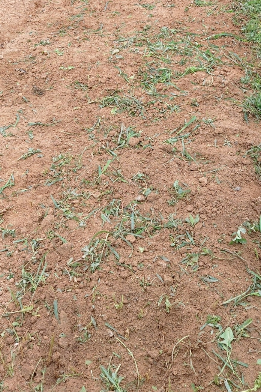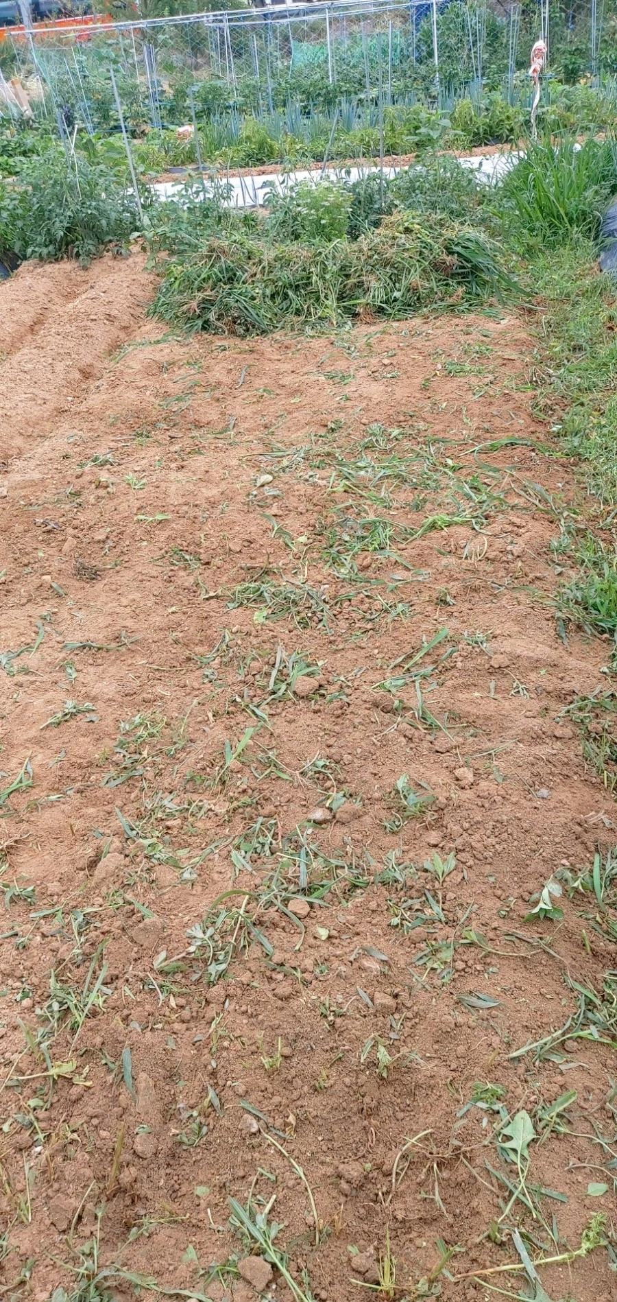 다행히 며칠 전 내린 비로 땅이 비교적 촉촉해서 생각보다 수월하게 풀이 뽑히긴 했지만 그래도 워낙 많이 자라서 쉽진 않았다. 특히 그령은 뿌리를 뽑아내기 제일 어려운 풀이다. 밭에 난 것들은 그래도 다 뽑아냈는데, 고랑에 난 건 너무 단단히 박혀있어서 가위를 가져다가 잎을 자르는 선에서 해결했다. 옆밭과 경계를 이루는 고랑에 있는 그령들은 특히나 뿌리까지 제거하려다 옆밭의 비닐까지 다 들어내게 생겨서 그렇게 타협을 했다. 문구용 가위밖에 없어서 그걸로 하자니 것도 꽤 힘이 들었다.