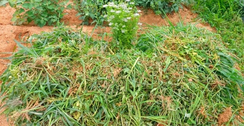 군데군데 모아둔 풀들을 쫘악 늘어뜨려서 텃밭의 거름으로 만들까 생각도 했지만 곧 장마소식이 있어서 그렇게 해두면 기껏 뽑은 풀들이 비 맞고 다시 살아날 가능성이 높았다. 고민끝에 밭 끝자락에 풀들을 옮겨서 몽땅 모아놓으니 아주 산더미다.