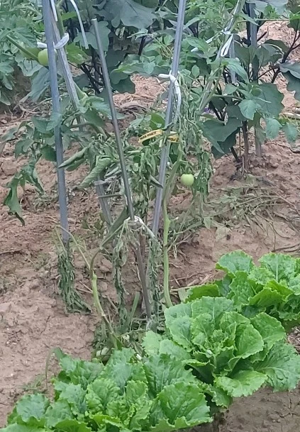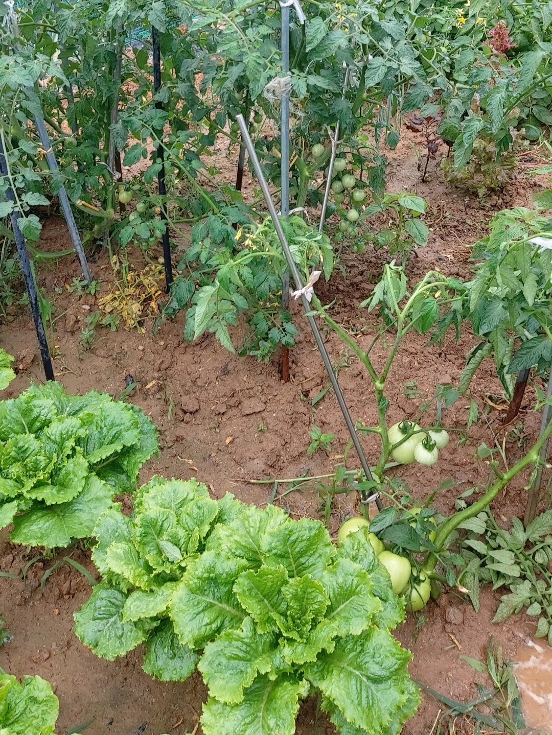 끝부분이 간당간당 붙어있긴 하지만 머지 않아 뚝 끊어질 모양새라, 주렁주렁 커다란 토마토가 달린 줄기 하나는 떼어내고, 작은 토마토들을 그냥 둔 채로 원줄기에서 떨어져나온 줄기를 땅에 심었다. 토마토줄기는 생명력이 강해서 순치기한 가지를 심어도 잘 자라니, 이 줄기도 살지 않을까 기대하면서. 과연 살아날런지 모르겠지만 어쨌든 시도해보기로.
