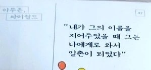 하지만 기표는 언제나 기의가닿지 않았다. 대부분 이런 시도는 예외없이 실패했고, 내 능력으로 도달할 수 없었던 야망의 민낯만 드러냈다. 고심 끝에 머릿속에서 나오는 것은 원츄원츄피카츄, 울트라나이스맨처럼 어딘지 B급 느낌이 나는, 하나같이 촌스러운 이름이었던 것이다. 일촌명을 지을 때 나라는 인간의 한계를 확인했다. 그래도 기발하게 짓고 싶다는 욕심은 끝끝내 버리지 못했기에 나중에는 의성어와 의태어 같은 무리수를 남발했다. '똑똑똑' '으쌰으쌰' '퐁당퐁당' 같은 몹쓸 일촌명들.