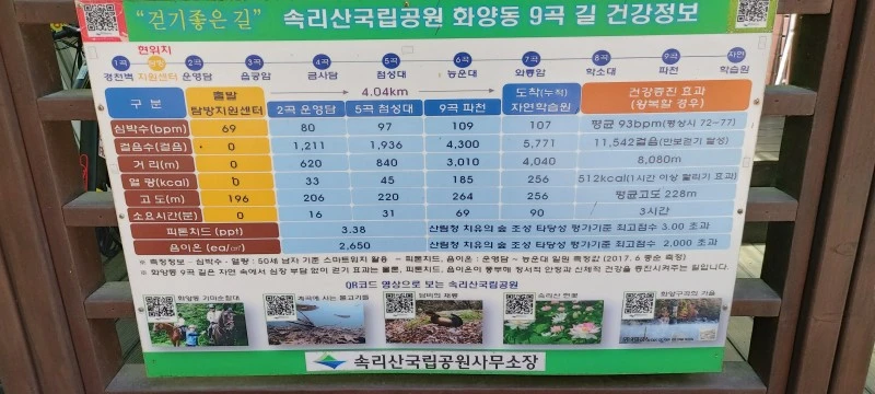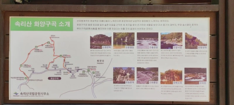 화양구곡 입구의 파출소와 119소방대를 지나면 오른쪽으로 바로 나오는 경천벽부터 시작해, 주차장과 화양동탐방지원센터를 지나 걷다보면 줄줄이 나오는 운영담·읍궁암·금사담·첨성대·능운대·와룡암·학소대와 마지막에 있는 파곶(파천)이 바로 화양구곡이다. 탐방지원센터에서 파곶까지는 3.7km라서 계곡 물소리를 들으며 신록이 우거진 산길을 걷기 딱 좋다.