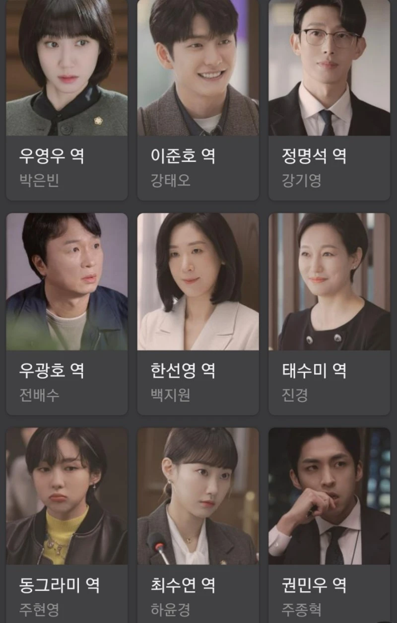 주인공 우영우 역할을 하는 배우 박은빈의 진짜 자폐인도 감탄하게 만들었다는 뛰어난 연기, 팀리더로서 우영우의 멘토인 시니어 변호사 정명석을 멋지게 소화해낸 강기영, 훈남에 따스한 성격까지 겸비한 송무팀 직원이자 영우의 편이 되고 싶은 이준호를 맡은 뉴페이스 강태오 외에도 미혼부로 외롭게 딸을 키워온 서울 법대 출신의 김밥집 사장님인 딸바보 우광호(전배수 분), 로스쿨 동기이자 경쟁의 현실과 영우를 챙기고자 하는 본성 사이에서 갈등하는 봄날의 햇살 같은 변호사 최수연(하윤경 분), 얄미운 라이벌이지만 그저 미워만 할 수 없는 권모술수 권민우(주종혁 분), 영우의 오랜 단짝친구이자 똘끼충만한 동그라미(주현영 분), 법무법인 한바다를 1등 로펌으로 키우고자 부심하는 대표변호사 한선영(백지원 분), 한바다와 경쟁하는 로펌 태산의 파트너 변호사로 법무부장관 후보로까지 거론되는 엄청난 능력자이자 영우의 숨겨진 엄마로 추정되는 태수미(진경 분)와 같은 조연들의 활약이 각자의 맛을 살리면서도 서로 조화롭게 어울리는 비빔밥처럼 맛깔나게 잘 차려져 나온다.
