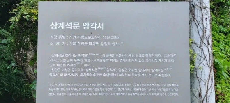 이 쌍벽루 아래 진안의 향토문화유산 유형 제5호인 삼계석문 암각서가 있어요. 이 암각서는 최치원이 태인에서 태산태수를 했던 그의 유풍이 전북인들에게 남아 있음을 증표하는 것중의 하나랍니다. 삼계석문 암각서는 비록 당시에 새기지는 않았지만 후대에 그를 흠모하고자 최치원 의 글씨를 탁본하여 새긴 것으로 알려져 있어요.