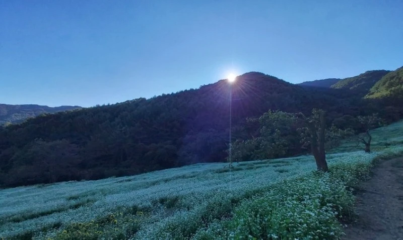 가장 더운 8월에 씨앗을 뿌려 9월 하순부터 피기 시작하는 메밀꽃은 10월 초 절정을 이뤄서 이효석의 '메밀꽃 필 무렵'에 나온 표현처럼 하얀 소금을 뿌려놓은 듯한 꽃물결이 바람에 일렁이는 풍경이 장관이랍니다. 마음씨 좋은 농장 주인 김대립씨가 무료로 이곳을 개방한 덕분에 누구나 와서 아름다운 가을추억을 남길 수 있게 됐어요.(김대립씨가 어떤 분인지 맨 아래에 자세히 소개합니다)