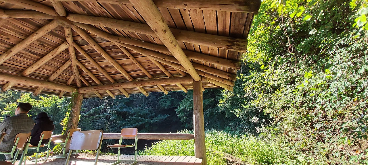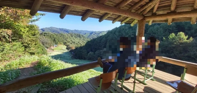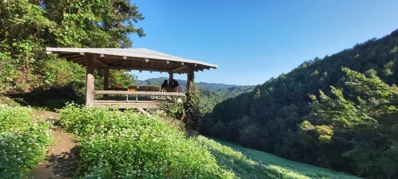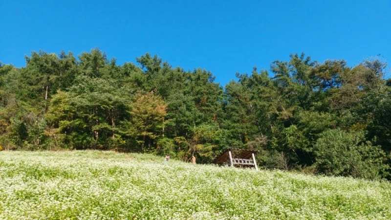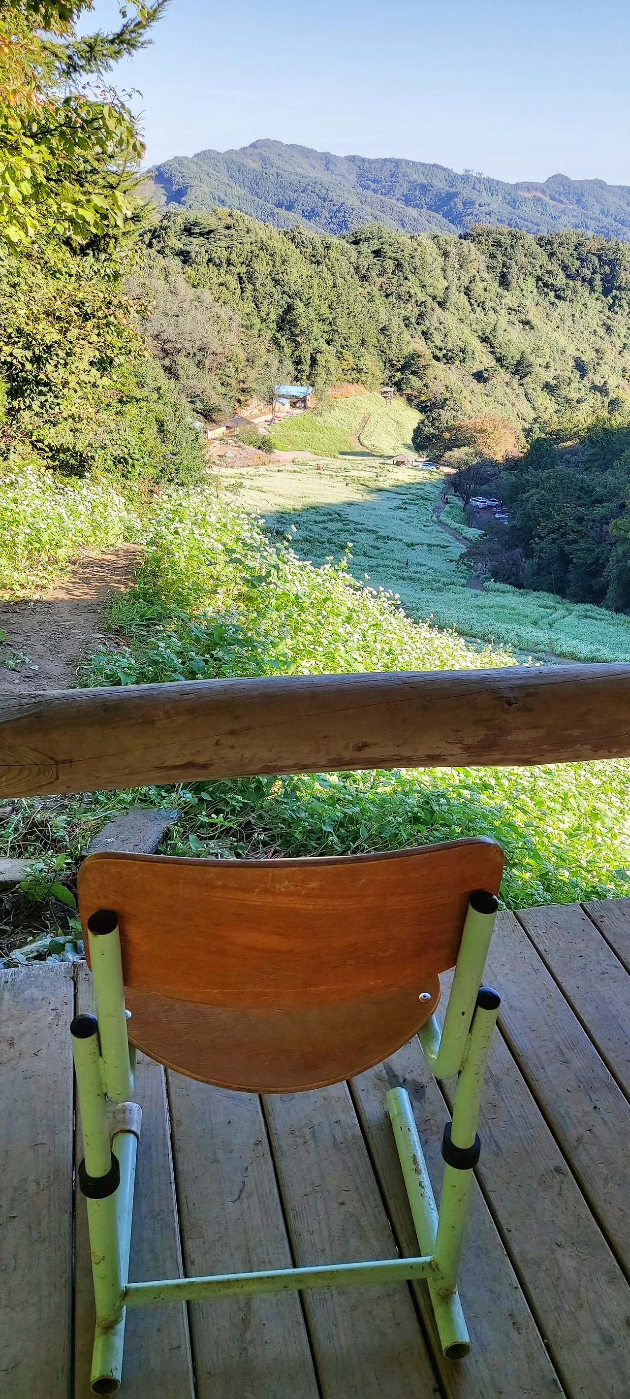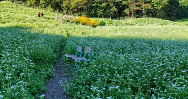 메밀밭 안쪽으로 깊숙이 들어가서 산으로 올라간 끝자락에 꼭대기 정자가 메밀밭에서 가장 높은 곳에 위치해있는데요, 어린 시절 학교에서 쓰던 나무의자(걸상)가 마련되어 있어 편히 앉아서 메밀밭 전경을 내려다볼 수 있어요.