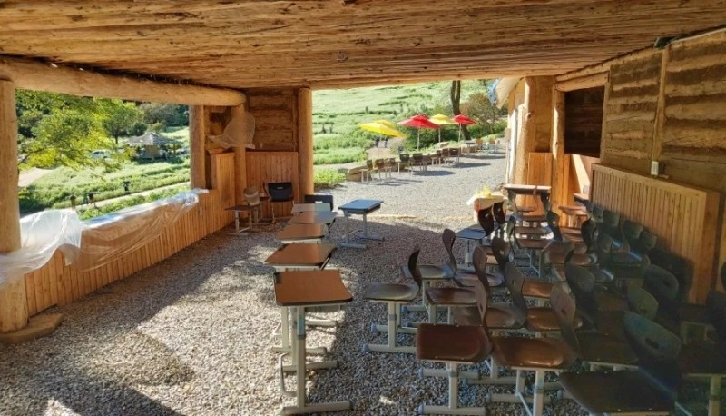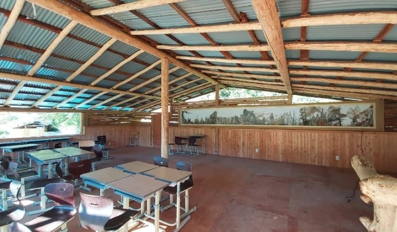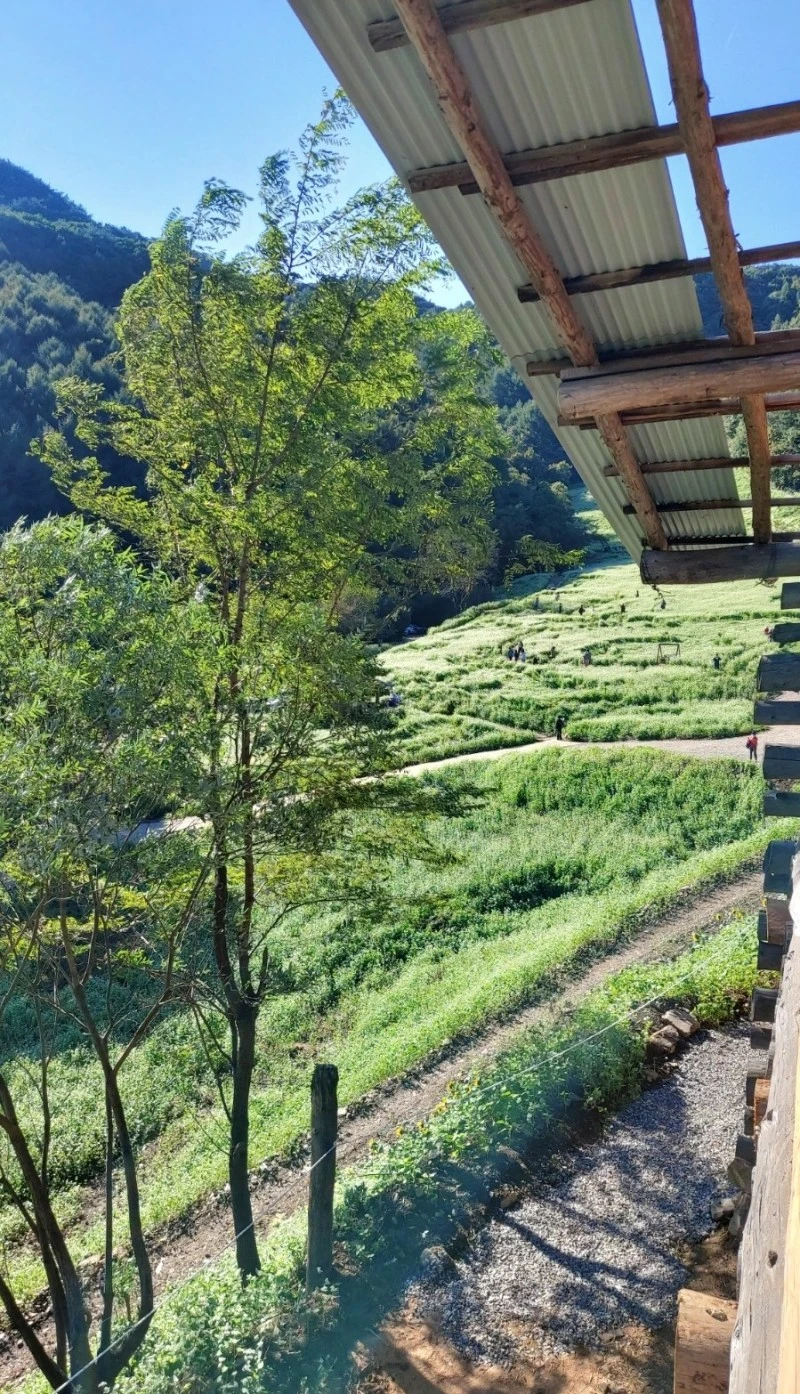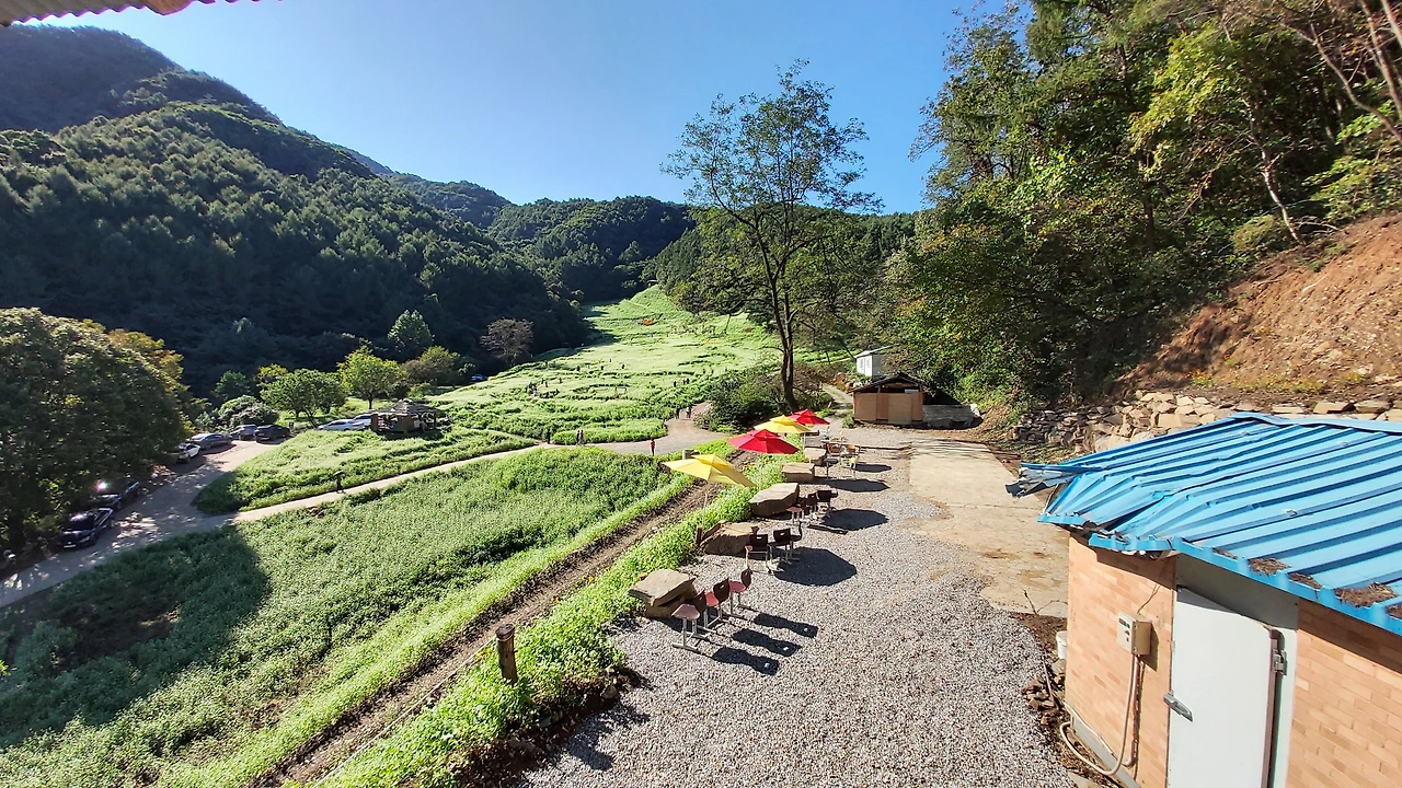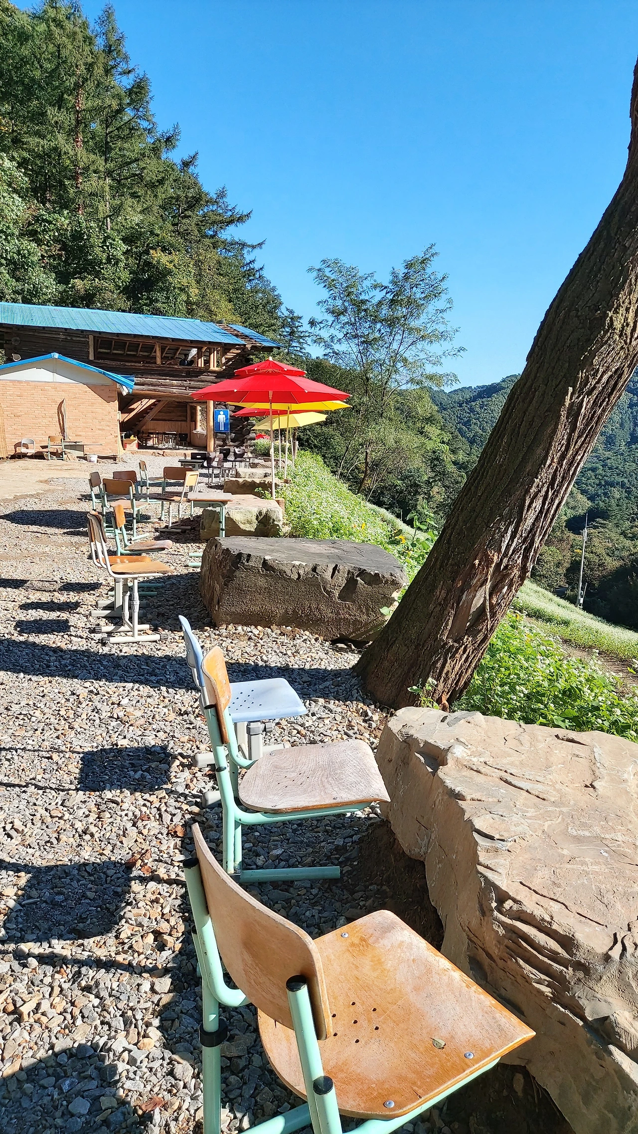 메밀밭 안쪽으로 깊숙이 들어가서 산으로 올라간 끝자락에 꼭대기 정자가 메밀밭에서 가장 높은 곳에 위치해있는데요, 어린 시절 학교에서 쓰던 나무의자(걸상)가 마련되어 있어 편히 앉아서 메밀밭 전경을 내려다볼 수 있어요.
