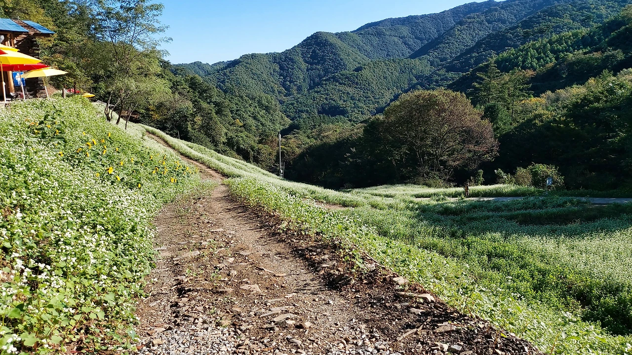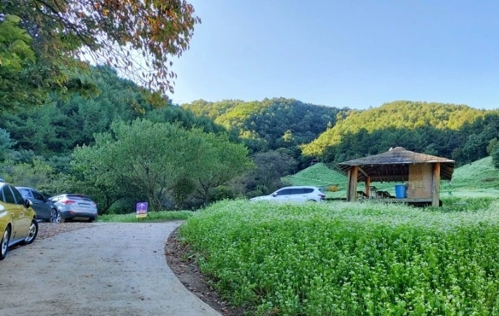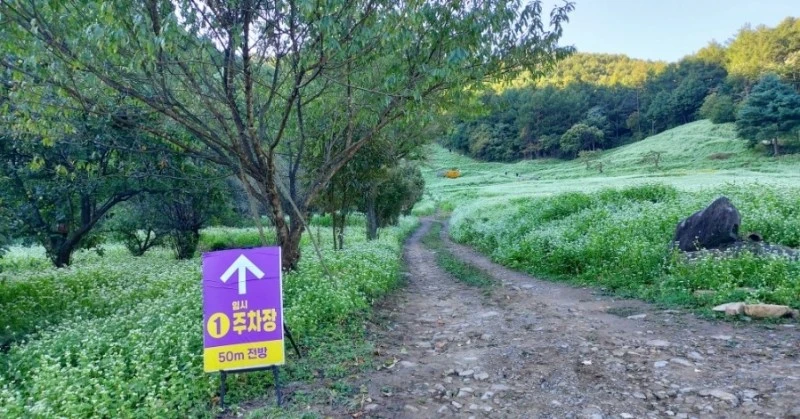 메밀꽃밭 인근에 주차장이 4곳 마련되어 있지만 주차가능 대수는 150~200대가 전부이고, 이마저도 안전상의 이유로 오전 10시~오후 5시에는 마을 안으로의 차량 출입을 통제해요. 그래서 방문객들 대부분은 마을 앞 도로(시속 80㎞ 구간)에 차량을 주차한 뒤 메밀밭까지 도보로 이동해야 해요. 걷는 걸 즐기시려면 그리 해도 되지만, 보다 편하게 구경하시려면 아침 일찍 가서 메밀밭 가까운 곳에 주차할 수 있답니다.