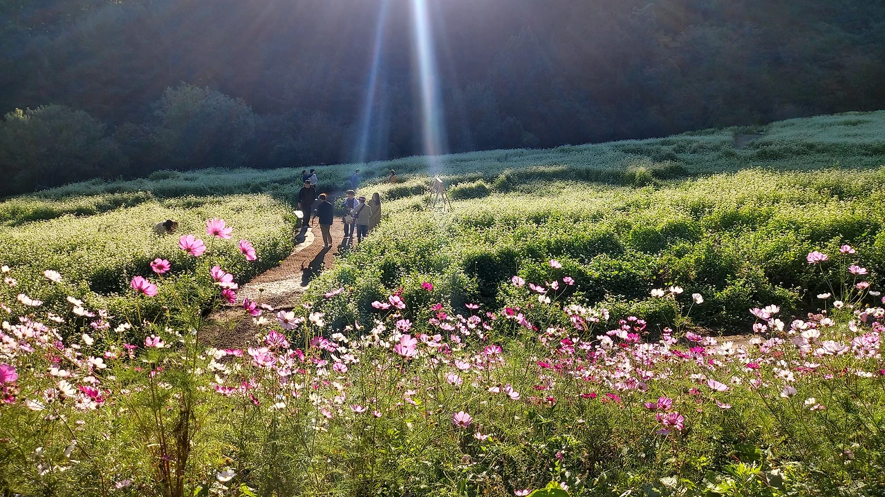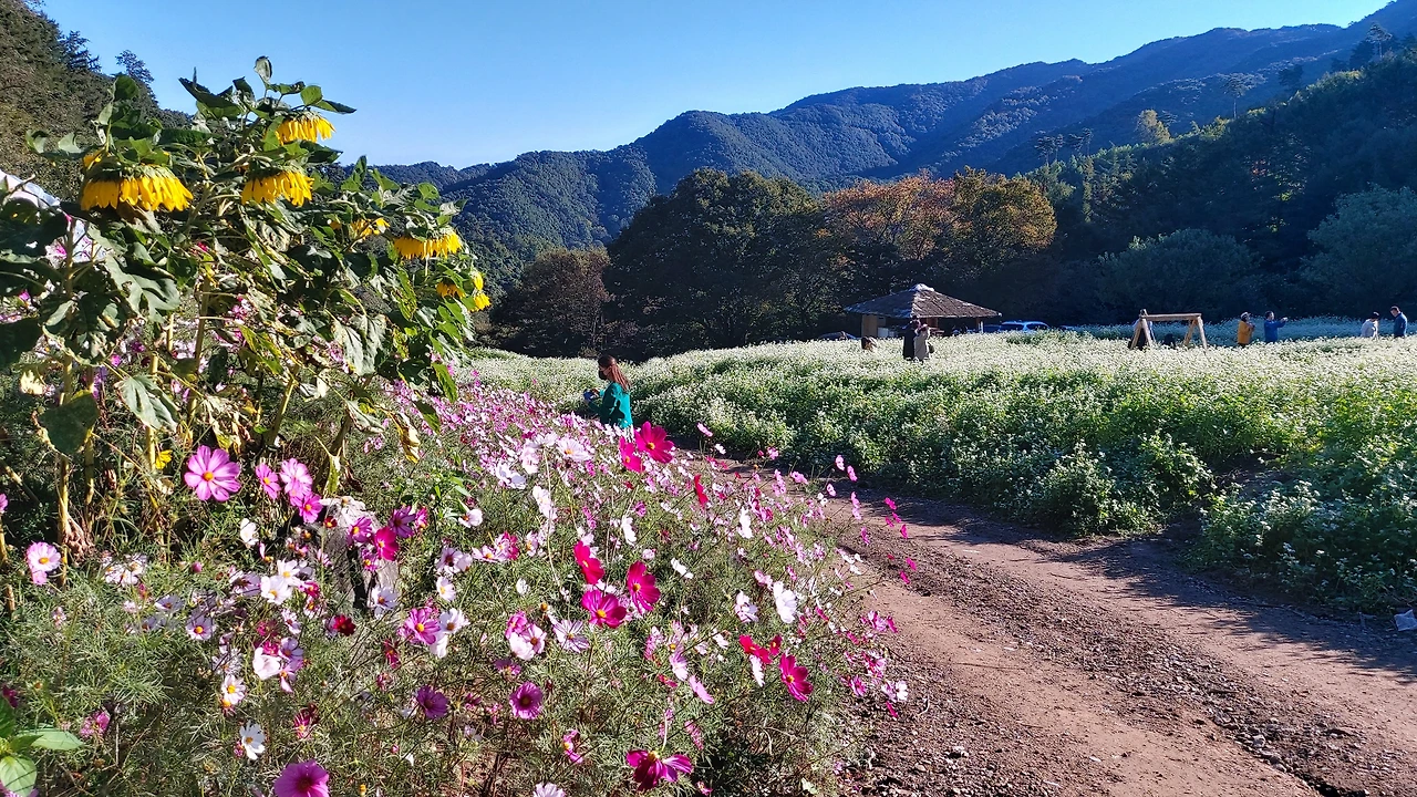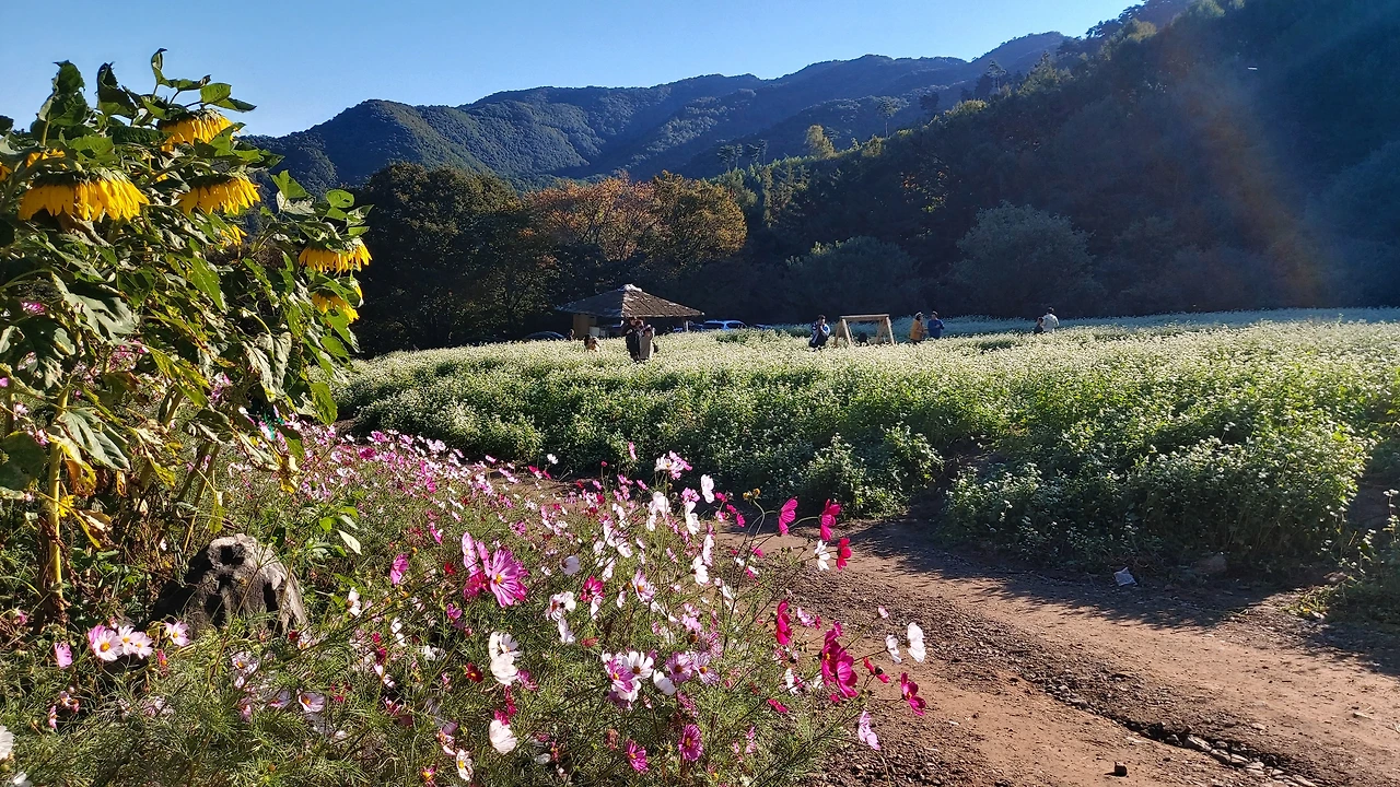 너른 메밀밭 곳곳에 마련된 정자와 나무의자, 돌의자, 그네가 그대로 포토존이 되고, 중간중간 코스모스와 해바라기 등 색감 좋은 꽃들이 심겨져있어 포인트가 되더라구요.