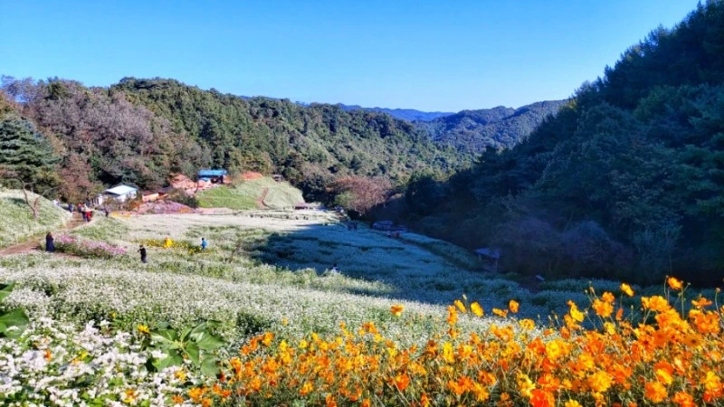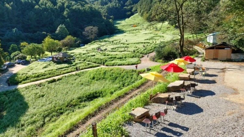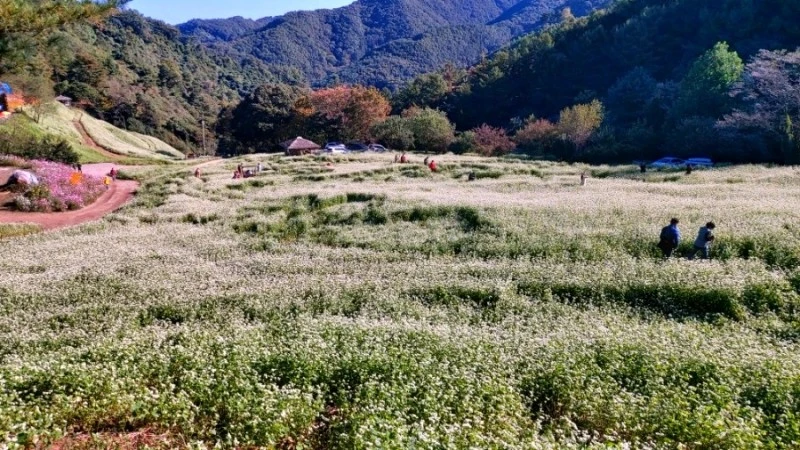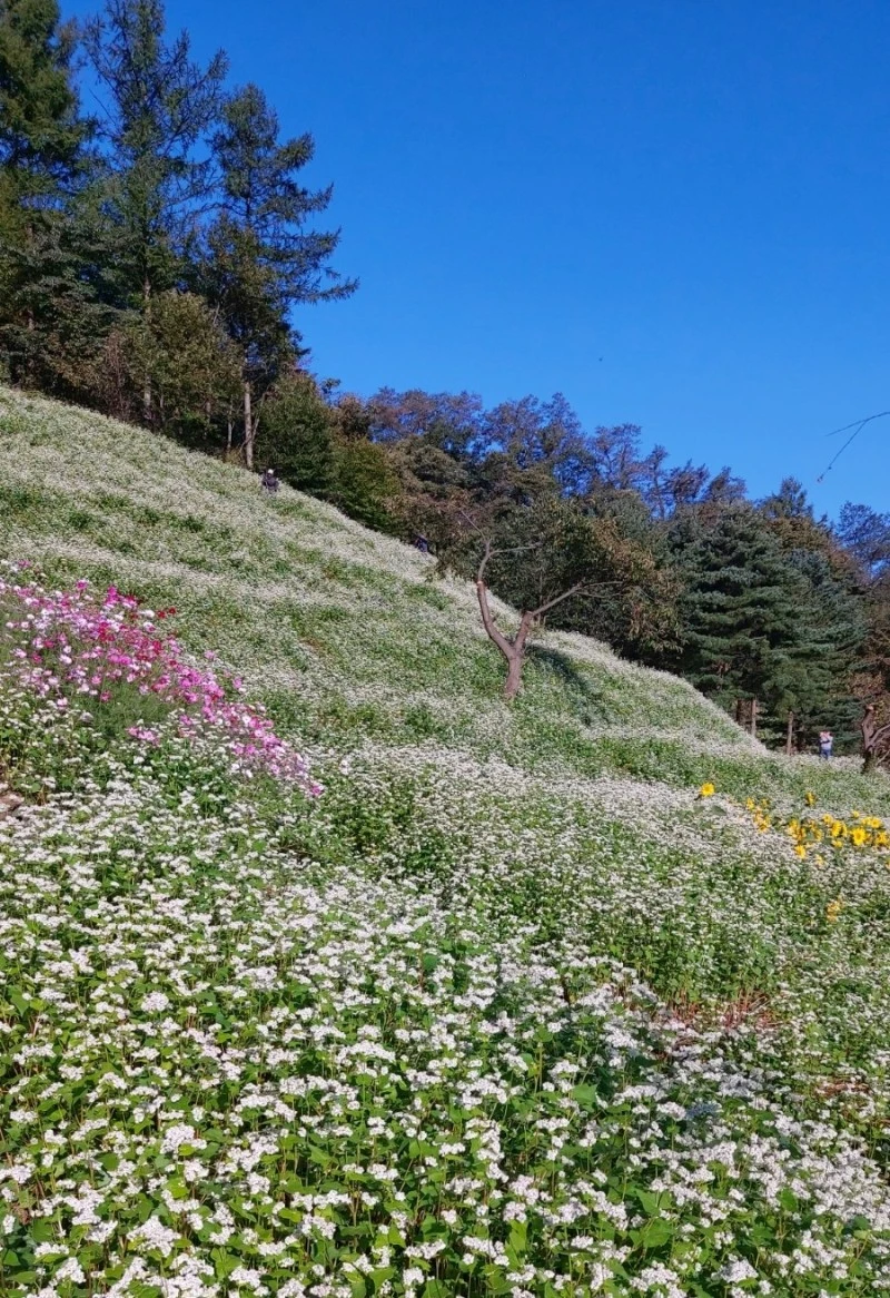 저희는 10월 8일 토요일 아침 9시에 갔는데, 그 이른 시간에도 이미 위쪽에 마련된 주차장은 가득 차고, 산속 메밀밭에 구경온 사람들이 많아서 깜짝 놀랐어요.