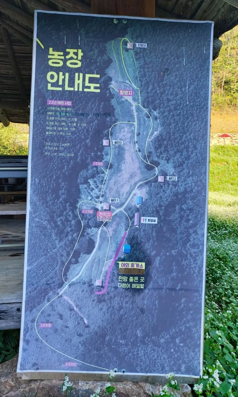 추진위는 2021년 11월에 노외주차장 설치를 청주시에 건의했지만, 아직까지 해결되지 않았다고 해요. 메밀밭 중간의 매점에 걸린 22년 농장의 예정사업을 보니, 6월에는 유채꽃 개화, 물앵두 따기 체험이 있고, 4~10월에는 토종벌 사육체험, 4월~6월 / 9월~10월에는 토종꿀 생산체험, 10월에는 메밀꽃 개화에 맞춰 무료개방을 하고 계시더라구요. 근처의 다다예술학교에서는 메밀밭에서 전시와 공연을 할 계획이구요.