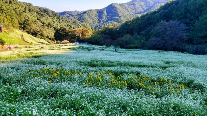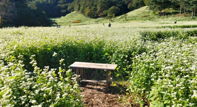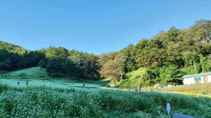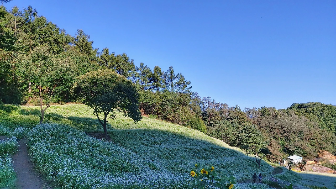 9월 말부터 메밀꽃이 피기 시작해, 10월 초에 절정을 이룬 추정리 메밀밭에는 아름다운 풍경을 눈에 담으려는 나들이객들이 줄을 지어 찾아오고 있답니다.
