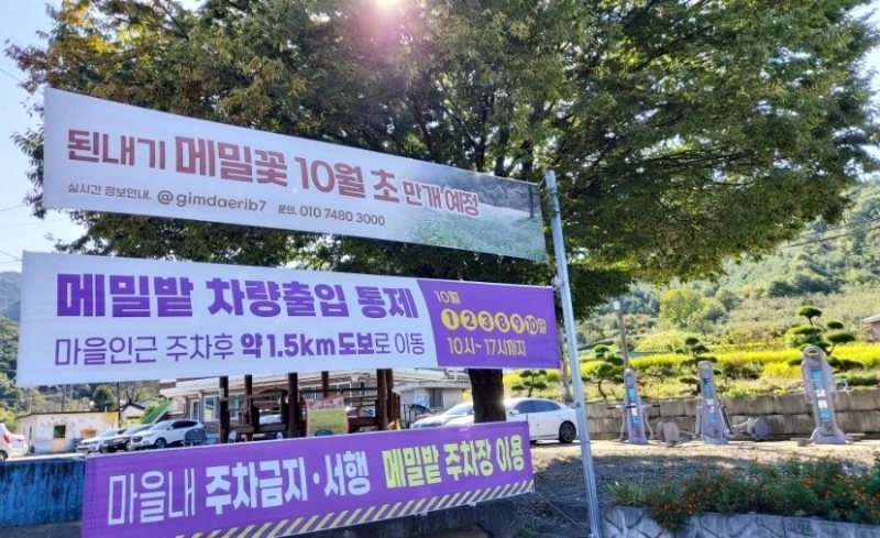 마을 주민들이 원활한 통행과 사고예방을 위해 하루 종일 나와 교통통제를 하고 있지만, 방문객 수가 점점 많아져 통제가 쉽지 않은 상황이라고 해요. 상당구 낭성면 추정리 마을추진위는 “타지 여행사들은 미동산 수목원, 추정리 메밀밭, 상당산성, 수암골 등을 청주 여행 코스로 짜서 방문한다”며 “올해는 만개 시 지난해보다 많은 20만여 명이 방문할 것으로 추정되는데, 주차공간 부족 등으로 인한 안전사고 위험성이 높아 지자체 지원이 절실한 상황”이라네요.