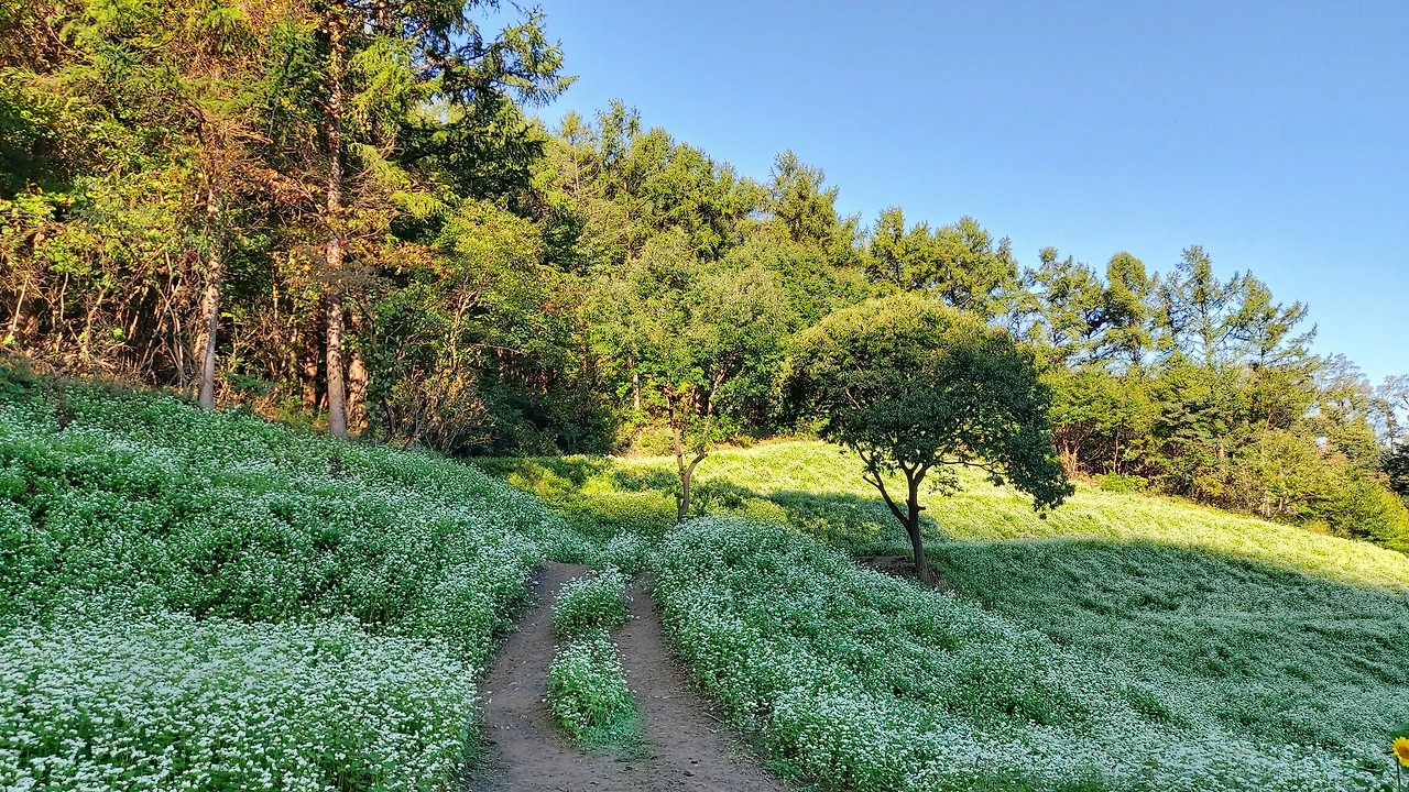 1, 2 주차장은 메밀밭 안에, 3주차장은 산 바로 아래, 4주차장은 산 입구에 있답니다. 그런데 메밀밭 안에 있는 1, 2주차장은 중간에 오르내리는 사람들을 비켜가야 해서 별로 추천하고 싶지 않아요. 메밀밭을 온전히 즐기려면 입구나 아래에 차를 대고 천천히 가을정취를 느끼며 걸어 올라가는 것을 추천합니다. 특히 주말에는 찾는 사람들이 많아 교행이 어려운 산길에서 애먹을 수 있으니, 차를 아래에 대놓고 산책하는 느낌으로 걸어올라가시는 게 좋을 듯합니다.