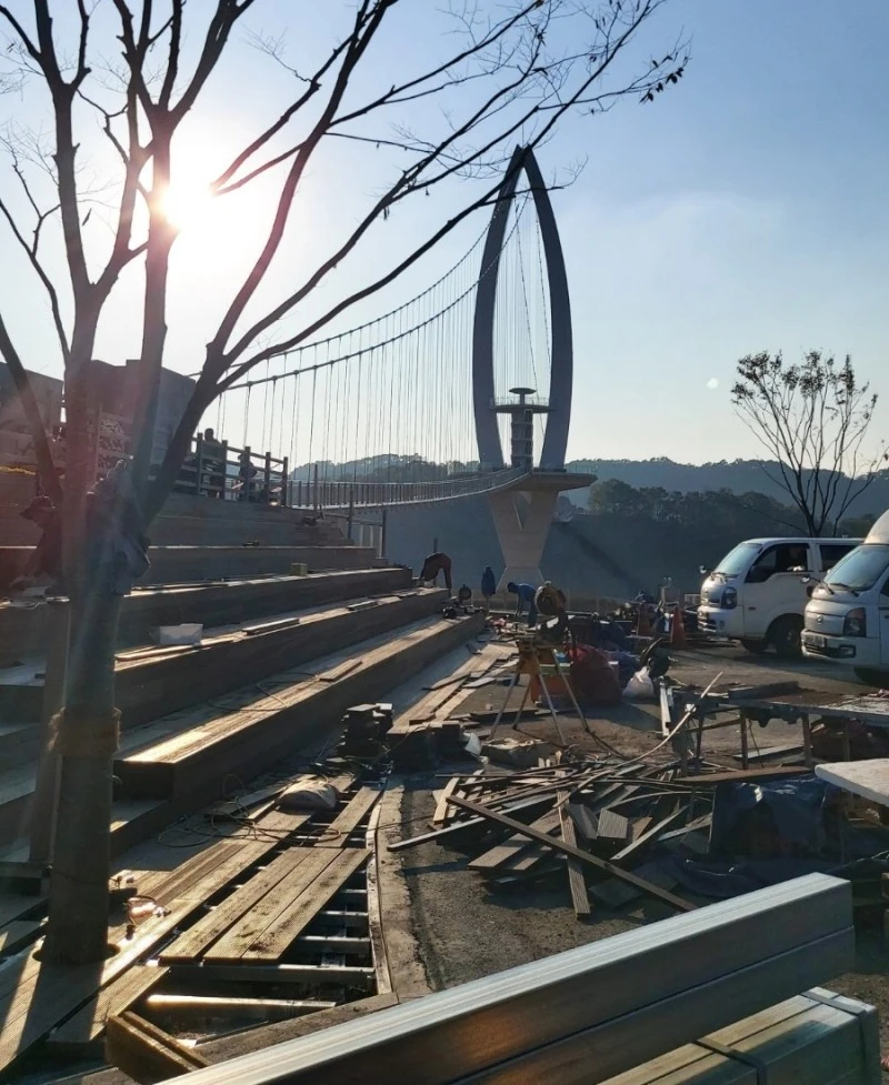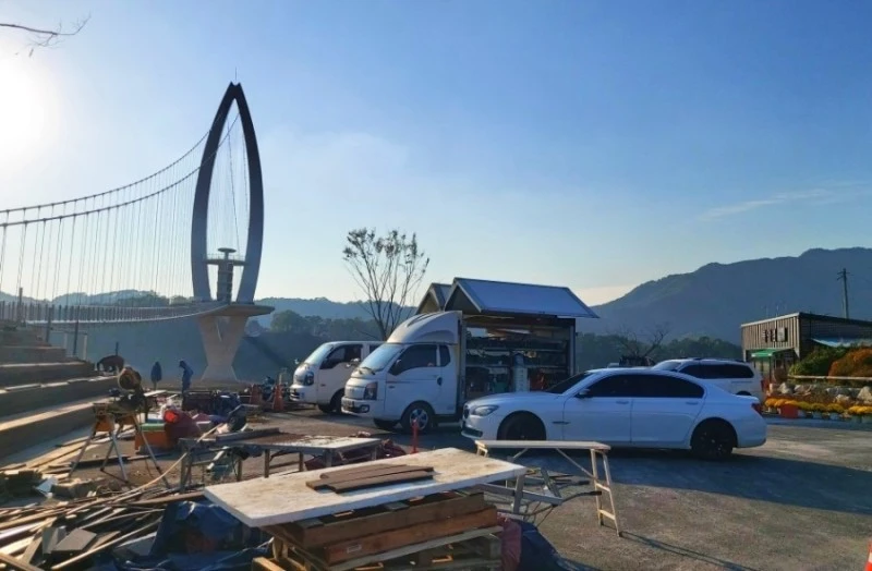 2022년 10월 15일에 임실치즈테마파크 갔다가 집에 돌아오는 길에 옥정호출렁다리가 다 완성됐는지 궁금해서 방문했더니, 10월 22일에 개통을 앞두고 마무리공사가 분주하더라구요. 매표소 앞으로 큰 주차장이 있는데, 그곳엔 차를 대지 못하게 하고 요산공원 들어오는 입구 도로에 차를 대게 안내하더라구요. 출렁다리 개통하면 사람들이 엄청 몰릴 텐데 주차장 확보에 더 신경써야겠다 싶었어요.
