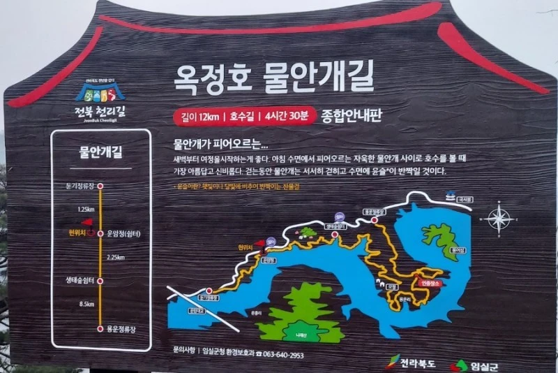 임실군에서는 옥정호의 아름다운 풍광을 가까이 느낄 수 있도록 2012년 호수주변에 물안개길을 조성했어요. 물안개길이 조성된 곳은 임실군 운암면으로 아름다운 길 100선에 뽑힌 옥정호 순환도로와 물안개 핀 경관이 장관인 외앗날(붕어섬), 선비의 모습을 하고 있어 이름 붙여진 국사봉, 운암의 좋은 경치를 읊은 시가 보존되어 있는 양요정, 임진왜란 전승을 기념하는 양대박장군 승전비, 3.1운동의 숨결을 담은 3.1동산 및 한영태열사 묘비 등을 살펴볼 수 있답니다.