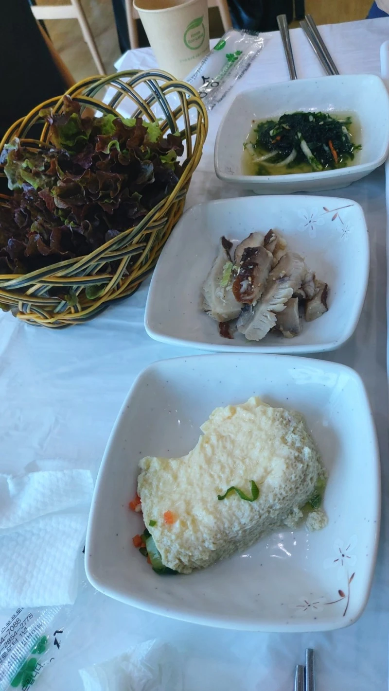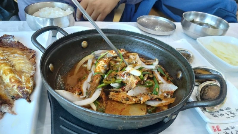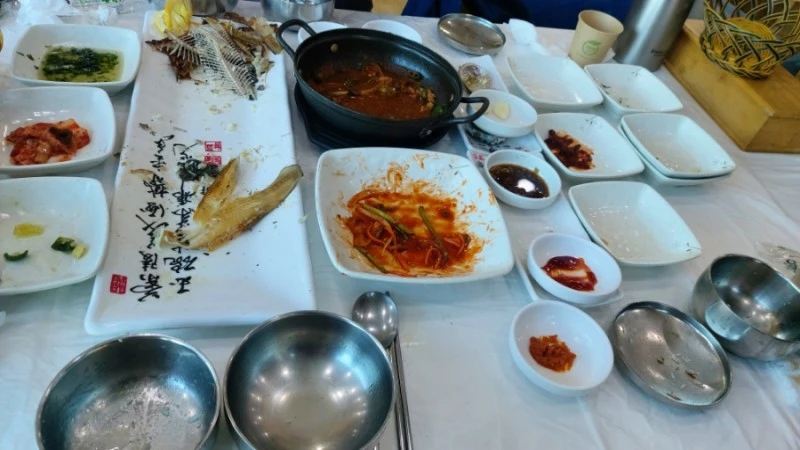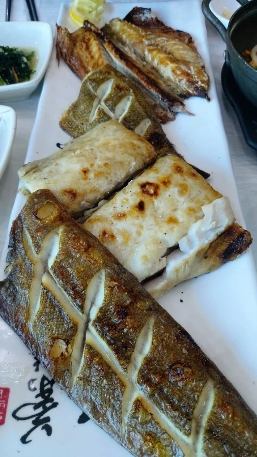 쌈 싸먹을 수 있는 멸치쌈이 뜨거운 뚝배기그릇에 담겨나오고, 네 가지 종류의 생선이 맛있게 구워져서 기다란 생선접시에 나오고, 맛깔나게 버무린 멸치회와 정갈하게 담겨진 반찬들이 나온 뒤 미역국과 밥이 마지막으로 나왔어요.