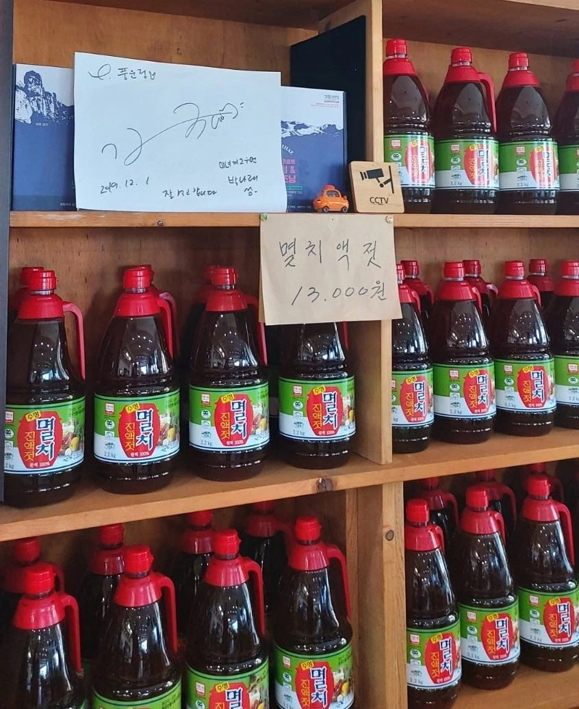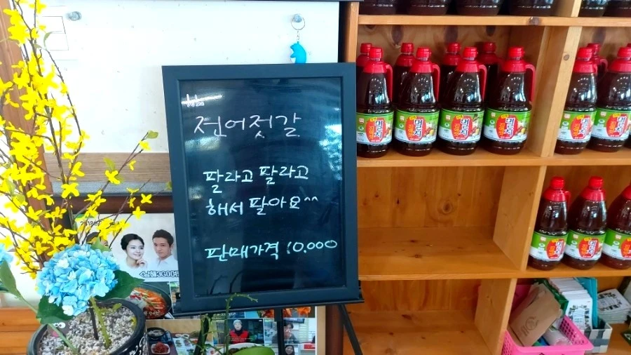 식사가 끝난 뒤, 계산대로 가니 계산대 옆에 손님들이 요구해서 파는 거라며 전어젓갈 판매한다는 문구가 보였어요. 어머님이 입맛에 맞으신지 잘 드시던 모습이 생각나 그것도 한 통 구입했어요. 남해의 대표상품인 멸치액젓도 전시해두고 파시는데, 멸치액젓은 집에 아직 많이 있어서 안 샀는데 집에 와서 생각해보니 살 걸 그랬나~ 싶게 맑은 액젓들이 눈에 삼삼하네요.