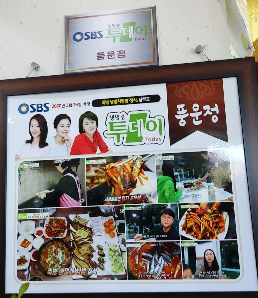 식당은 프라이빗한 룸과 너른 홀로 구성되어 있었어요. 원조 멸치쌈밥 남해밥집 풍운정의 전통이 느껴지는 청결하고 깔끔한 인테리어가 보기 좋았는데요, TV 프로그램 '생방송투데이'에 나왔다는 홍보문구가 눈에 띄었어요. 현지인뿐만 아니라 남해를 찾는 여행객들이 꼭 찾는 맛집인 이유가 있었네요. 기다리는 동안에도 손님들이 계속 들어오시더라구요.