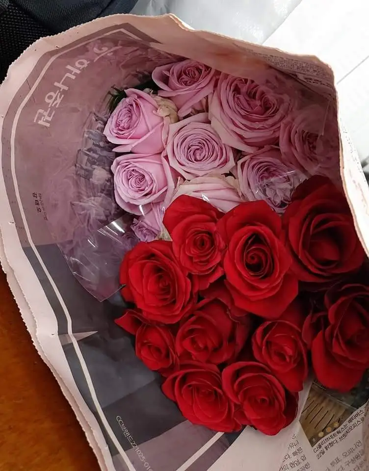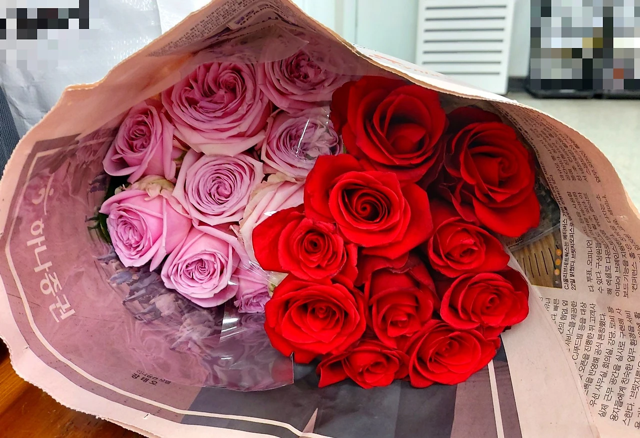 올라가보니, 생화 마감시간이 12시였다. 노브랜드에서 만난 그분이 잘못 알고 있었던 덕분에 좀 뛰긴 했어도 여유롭게 돌아보며 꽃을 고를 수 있었다. 꽃이 예쁜 게 정말 많아서 고민고민끝에 연분홍빛이랑 진붉은빛 장미 두 단을 골랐더니, 신문지에 둘둘 말아서 줬다. 여긴 다 그렇게 최소한의 포장으로 꽃을 판매하고 있었다.