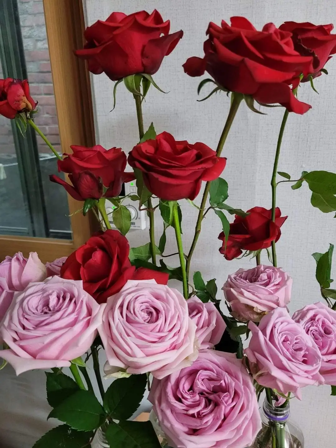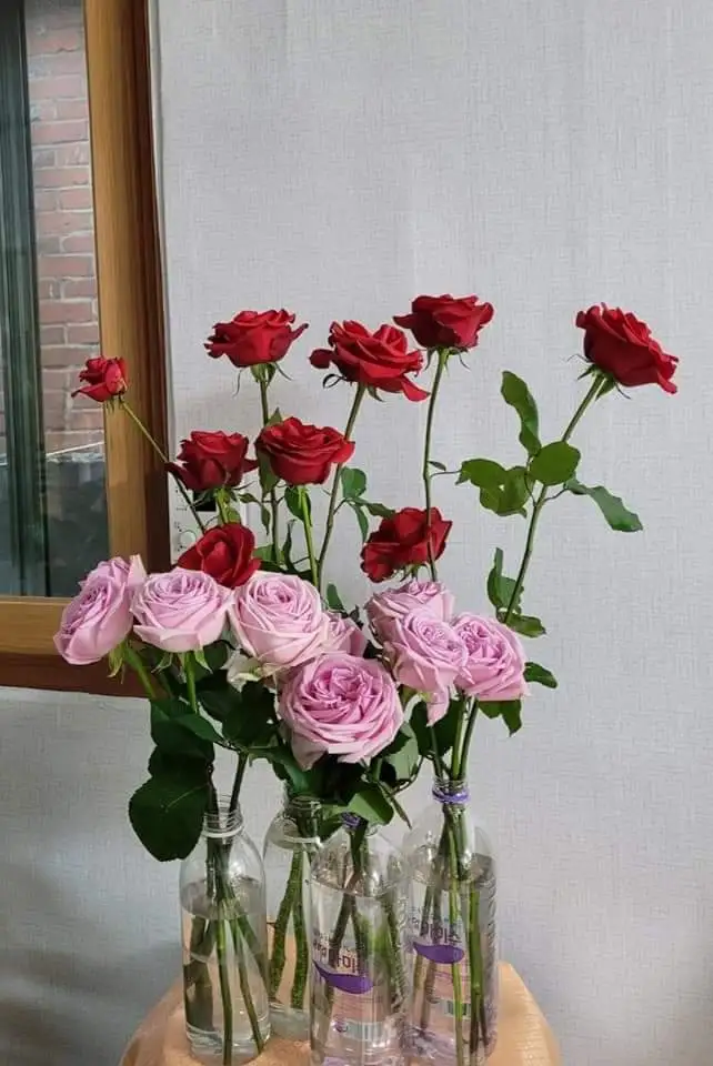 임시방편으로 페트병에 물을 담아 장미를 꽂아두신 사진과 함께...