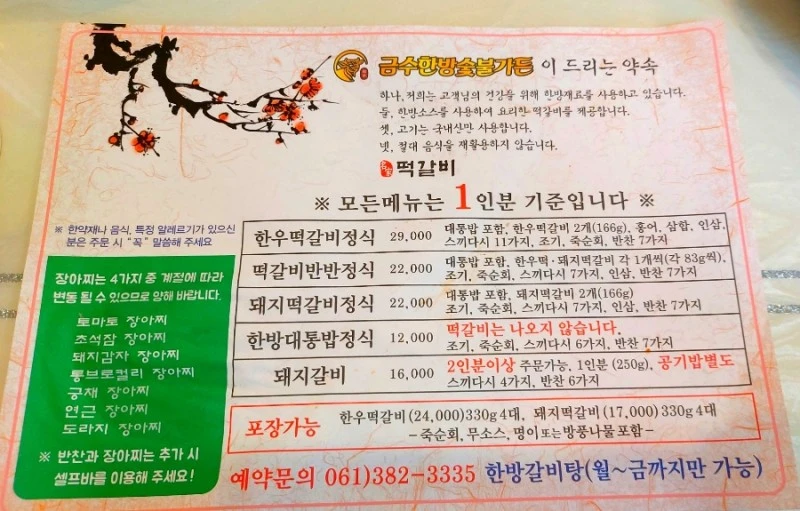아직 예약시간이 아니라 화장실만 이용하고 내려와서 기다리려고 했는데, 지금 드셔도 괜찮다고 하시며 비어있는 룸으로 안내해주시더라구요. 손님들 많은 시간인데도 사장님과 직원들 모두 친절해서 기분 좋은 인상을 받았어요. 유명맛집 가운데는 친절함을 찾아보기 어려운 곳들도 있어서 식사하기 전부터 빈정 상하는 경우가 종종 있는데, 금수한방은 정말 친절하시더라구요.
