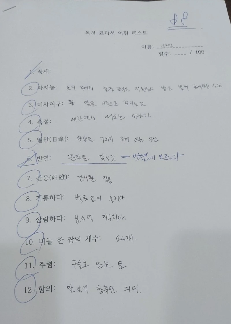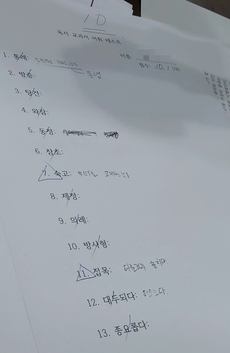 아들은 문장을 빠짐없이 읽긴 하지만 읽어내리는 속도가 많이 느렸다. 아무래도 어휘력이 부족해서 문장이해도가 낮다보니 글 읽는 속도가 느릴 수밖에 없었다. 시선추적 뒤 받은 어휘력 테스트에서도 겨우 10점을 맞았다.