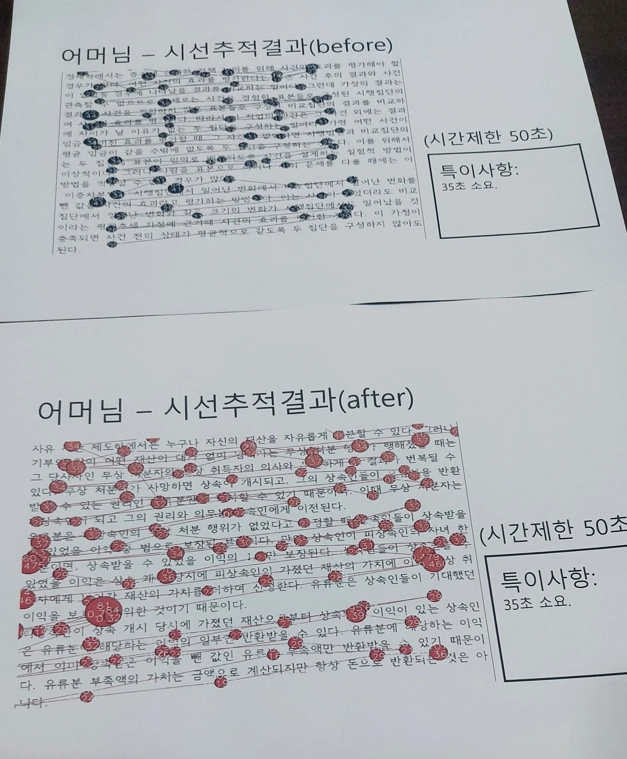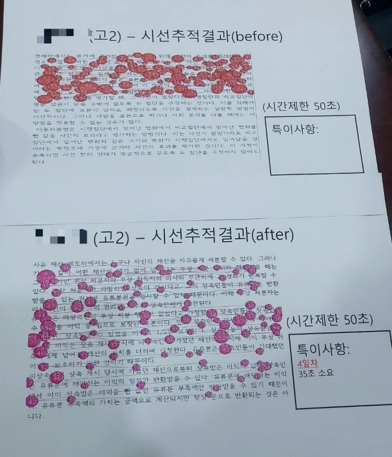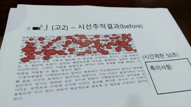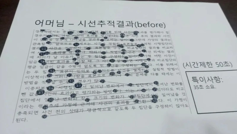 수업전에 과연 난독 현상이 어느 정도인지 테스트해보는 시선추적검사를 실시했다. 객관적인 지표가 필요한 부분이라 이런 검사는 반드시 필요한 부분이었다.