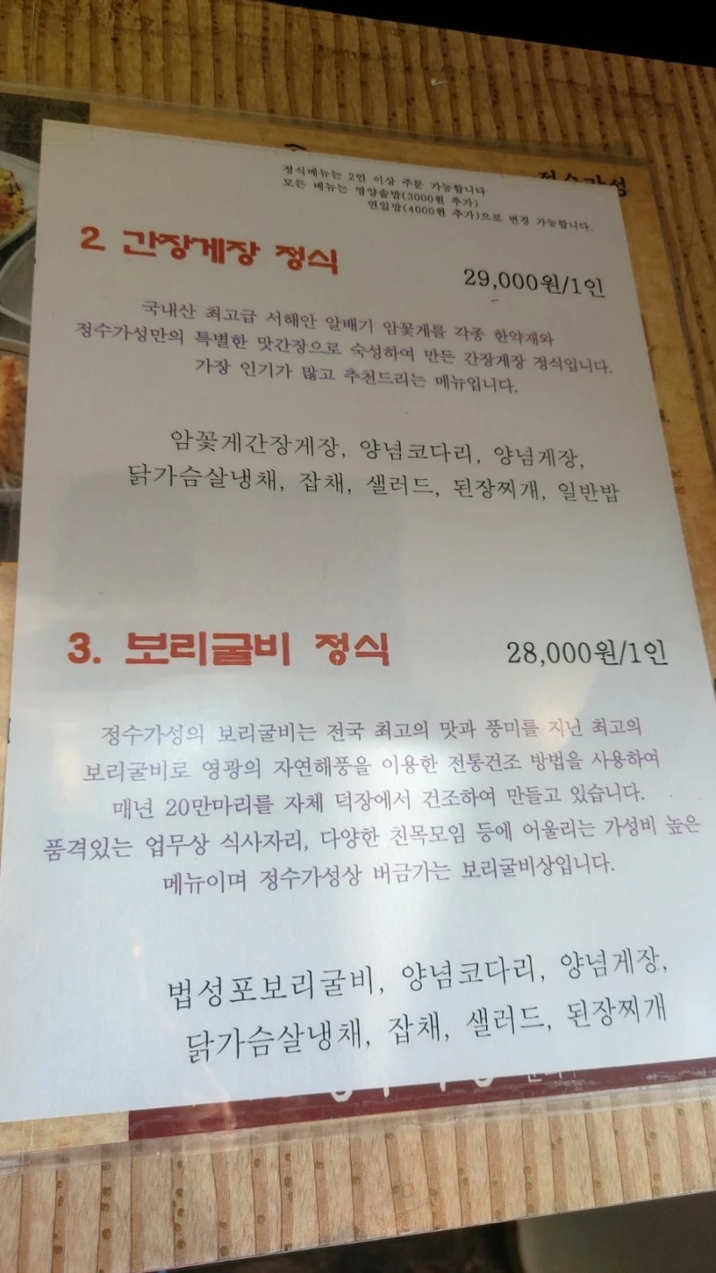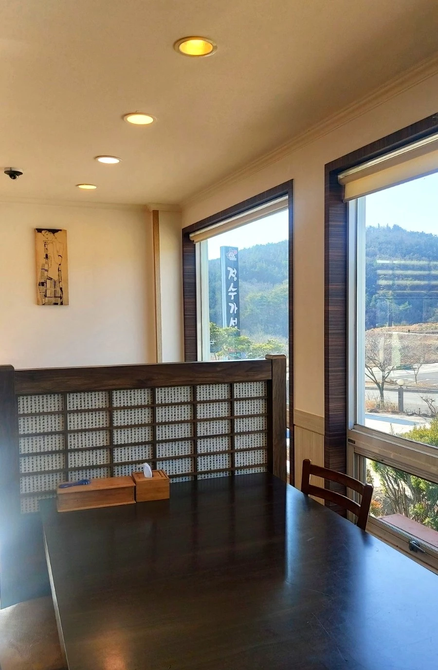 제일 먼저 70대 이상 수용 가능한 대형 주차장이 있어서 주차 때문에 스트레스 받을 일이 없고(주차요원 투입시 최대 150대 수용 가능), 테이블 수가 45개(수용 인원 180명)에 달하는 대형 매장이니 인원수 많은 데 식당이 좁을까봐 스트레스 받을 일도 없고, 며칠 전에 전화로 미리 예약하면 테이블을 추가 비치하여 인원수 350명 이상까지 수용이 가능하고, 입식(의자) 테이블 뿐만 아니라 좌식(온돌방) 상도 있어서 아이들과 함께 온 가족이 식사하기 좋은 곳이 바로 '정수가성'이었어요.