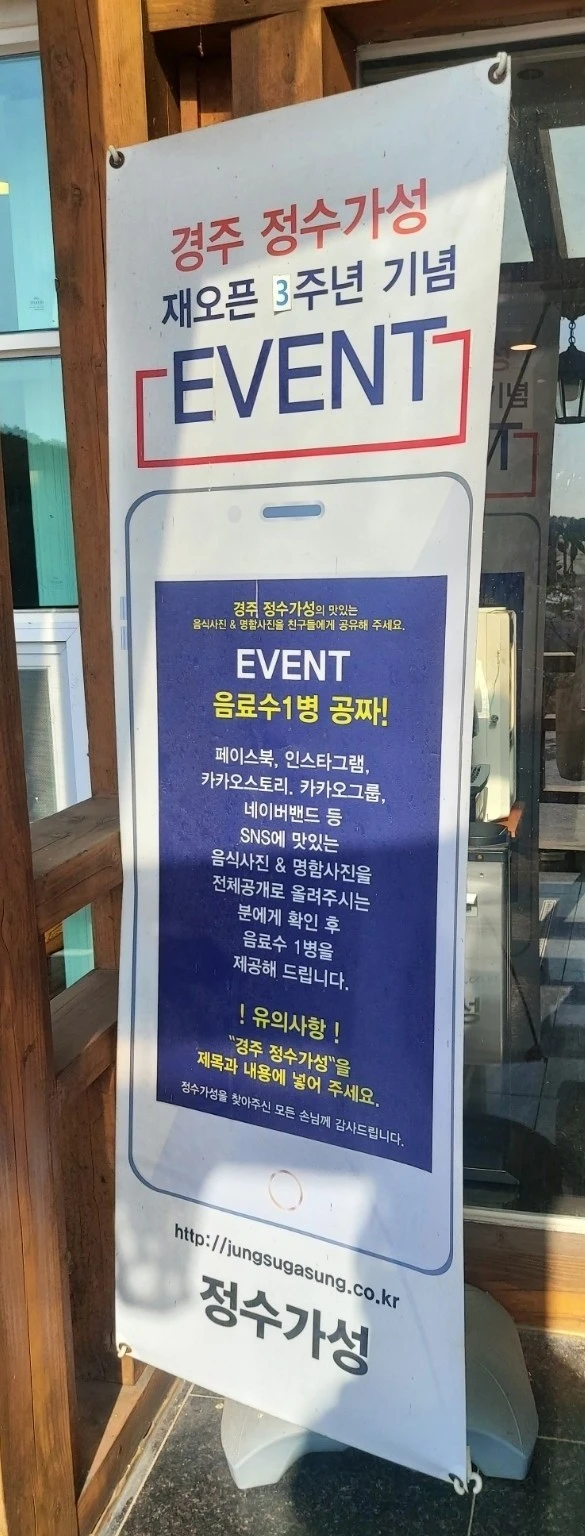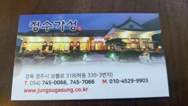 정수가성 : 경북 경주시 보불로 318 영업시간 : 10시~21시 (휴무일 없이 매일) 전화 : 054-745-0066 단체석 구비, 너른 주차장, 포장됨, 예약됨