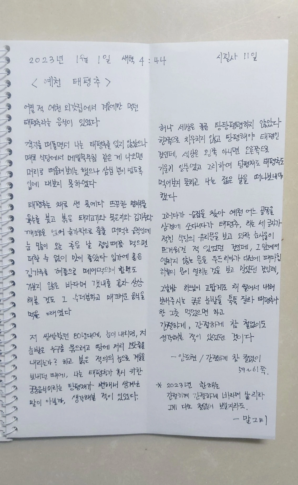 제가 오래전부터 추앙해오던 안도현 시인의 시집 <간절하게 참 철없이> (창비. 초판 2008년 1월 21일)에서 59쪽에서 61쪽에 걸쳐 나오는 '예천 태평추'입니다.