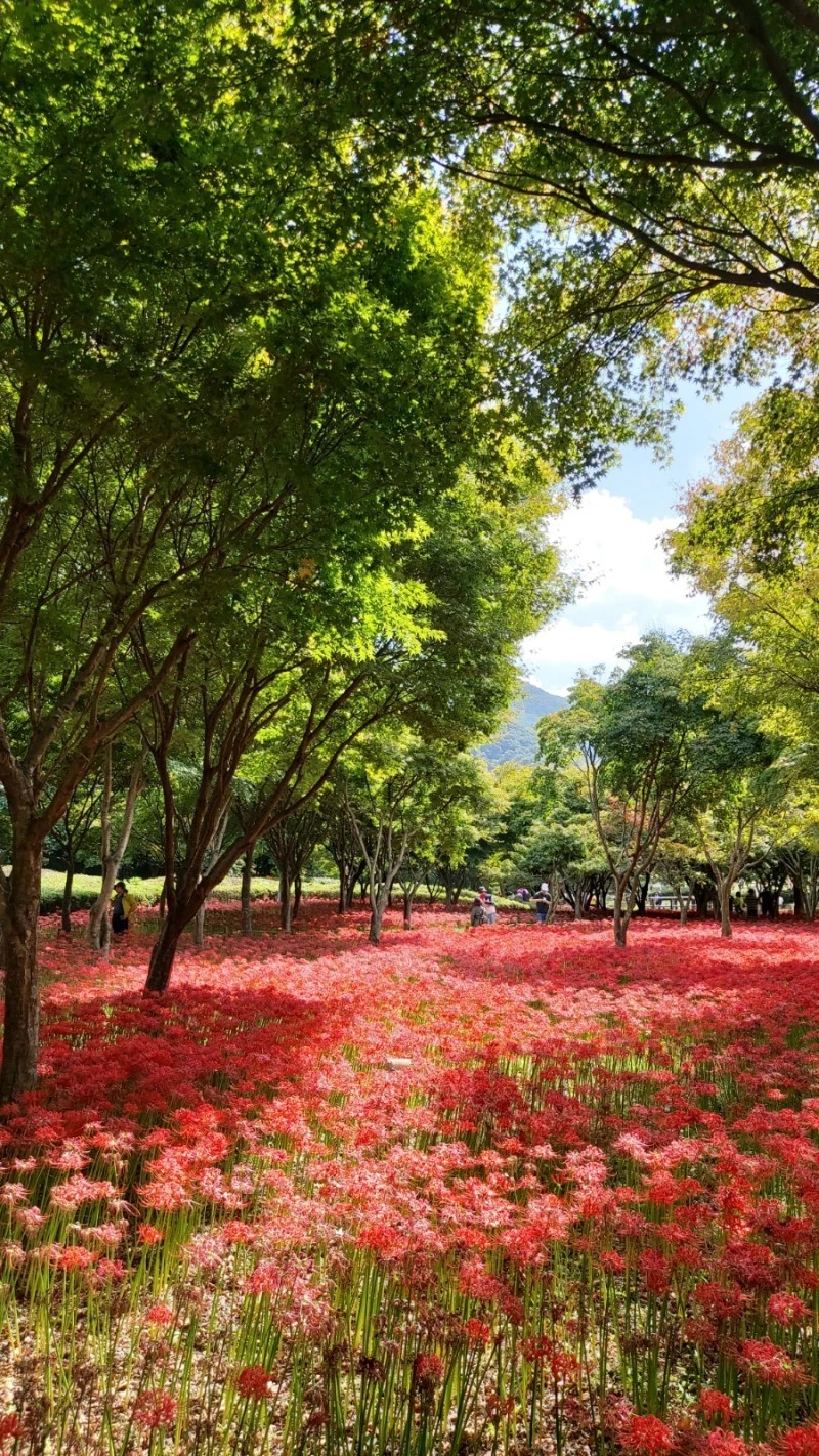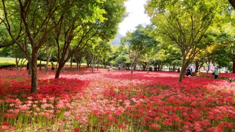 그중 꽃길 사이에 있는 산책로 왼쪽편으로 단풍나무 아래 꽃무릇이 쫘악 펼쳐졌는데, 마침 나무 사이로 햇살이 환하게 내리비쳐 누구나 다 발걸음을 멈추고 사진을 찍는 포인트가 있었다.