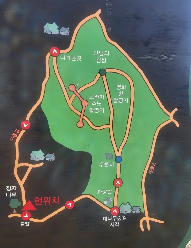 대숲 중간에 있는 우물터를 중심으로 길이 갈라지는데, 오른쪽으로 직진하면 만남의 광장이고 왼쪽으로 올라가면 추노 촬영지예요. 하지만 이 길들도 결국 숲 안에서 이어진답니다. 평일이라 찾는 이가 거의 없어 더더욱 한적한 대숲에 이는 바람소리 들으며, 폭신한 길을 이렇게도 저렇게도 걸으며 유유자적했네요.