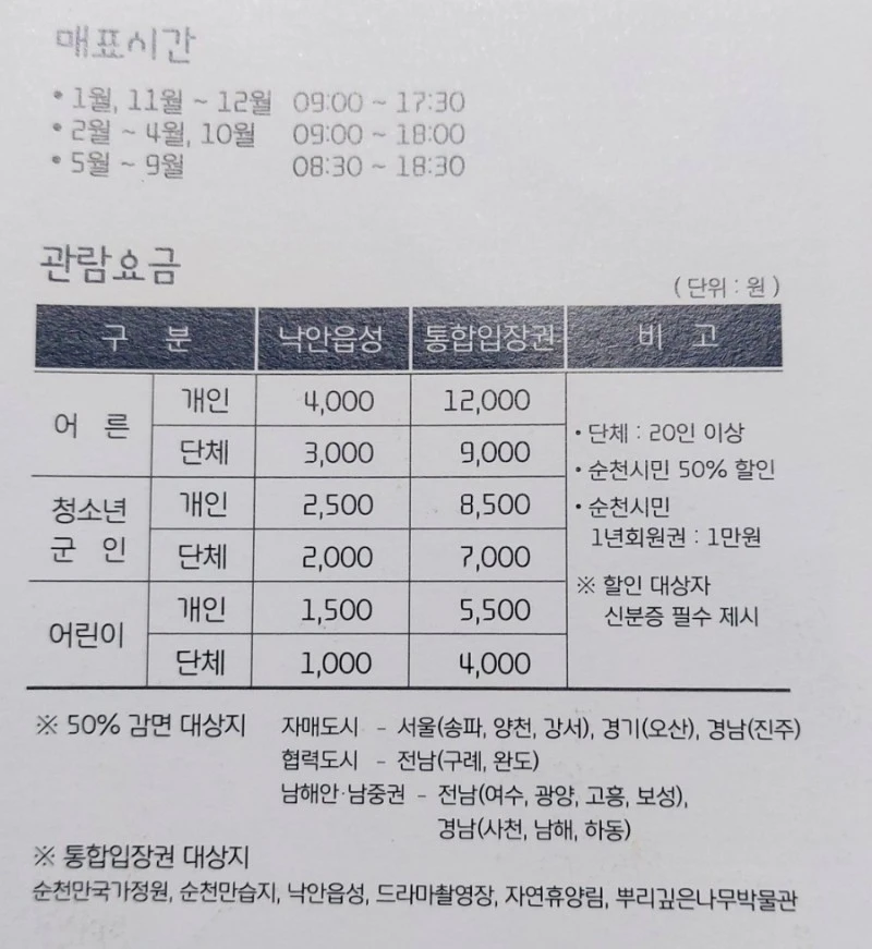 주차료 무료, 입장료 어른 4천원/ 청소년 군인 2500원 / 어린이 1500원 (할인관련 내용은 아래 표 참고)