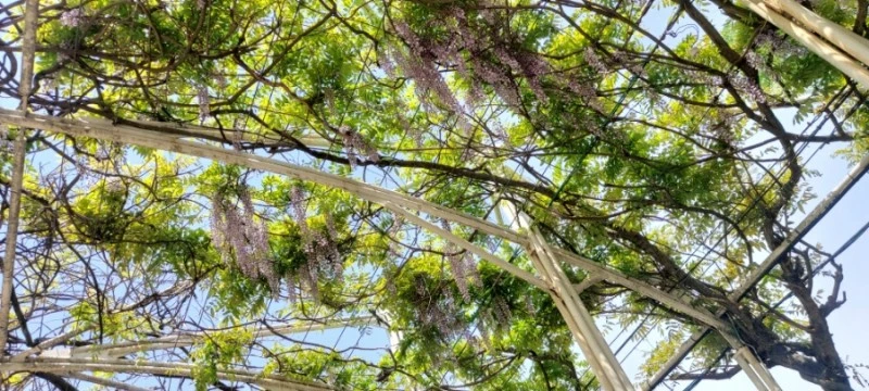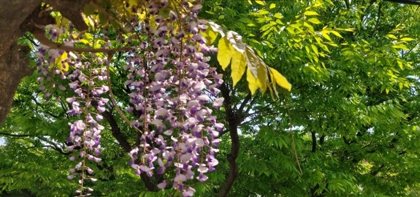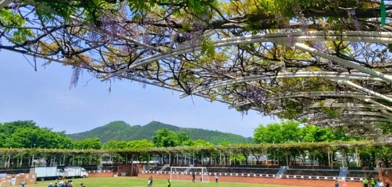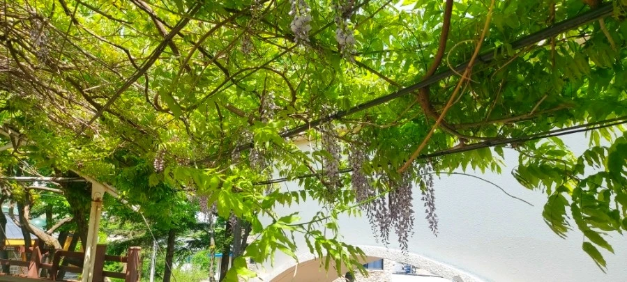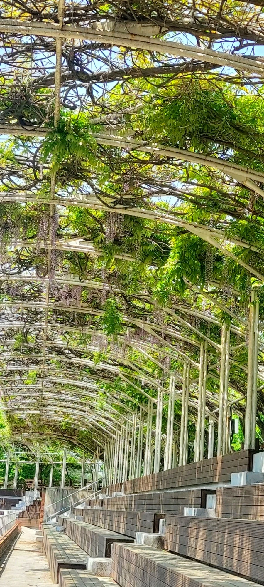 무주등나무운동장의 전체 면적은 11,698㎡이고, 규격은 121.5m×65m. 전체 좌석수는 3,587석[본부석 144석, 관람석 3,443석], 수용 가능 인원은 5,000석이라고 해요. 스탠드 위에 파고라를 설치하고 다시 그 위에 500여 그루의 등나무가 조성되어 있어요. 군민의 날에 참여하신 무주군민들이 이 등나무 아래에 자리를 잡고 앉아들 계시고, 운동장에서는 행사가 진행중이라 여유롭게 즐기진 못하고 등꽃 핀 풍경만 찍고 얼른 나왔어요. 등꽃은 이제 막 피기 시작한 건지 기대했던 만개한 모습은 아니었어요.