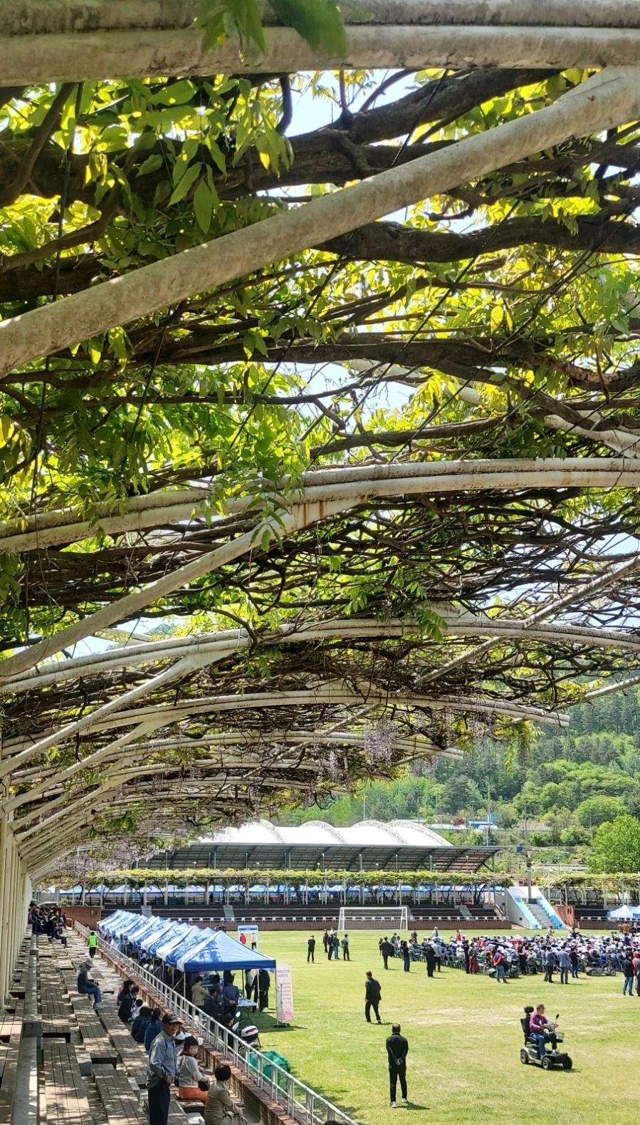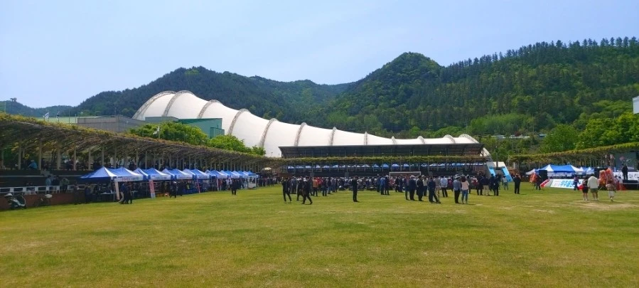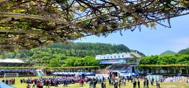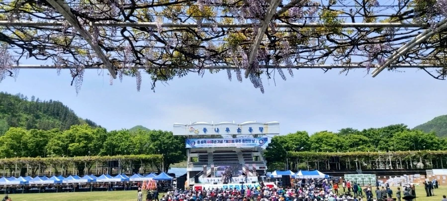 5월 첫날 등나무운동장에 등꽃이 만개한 풍경을 보러 갔는데 그날이 마침 무주군민의 날이어서 많은 분들이 행사에 참석하셨더라구요. 무주 군민의 단합 활동과 무주군에서 열리는 주요 행사의 개·폐회식 장소로 활용하기 위해 조성한 운동장인 만큼 그 역할을 충실히 하고 있었어요.