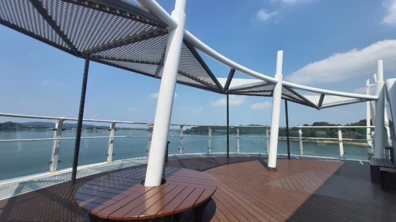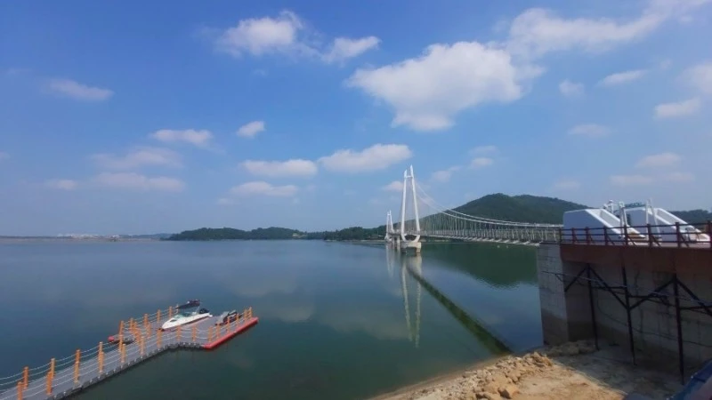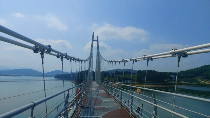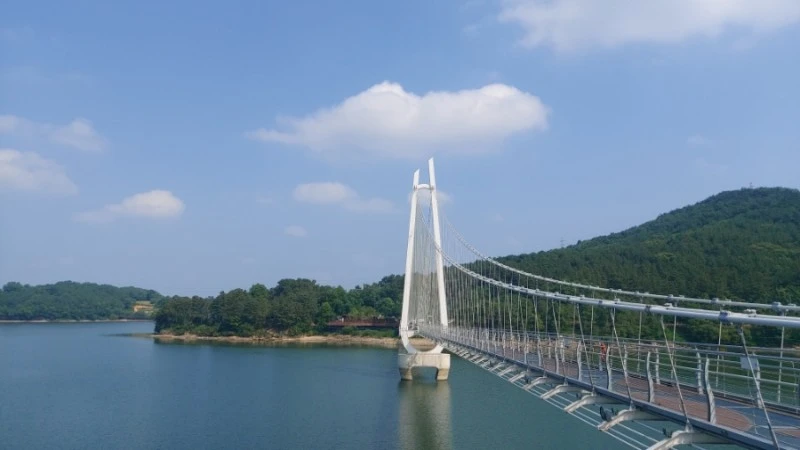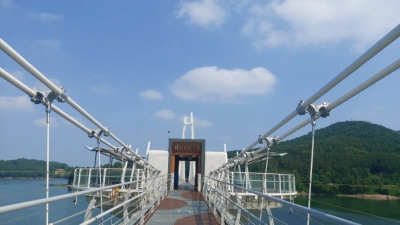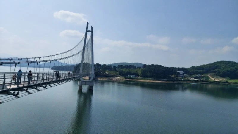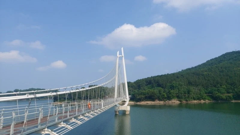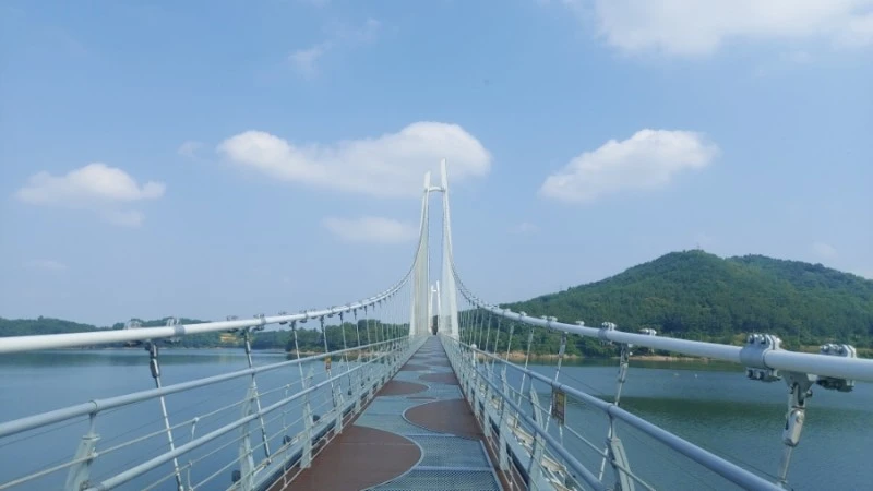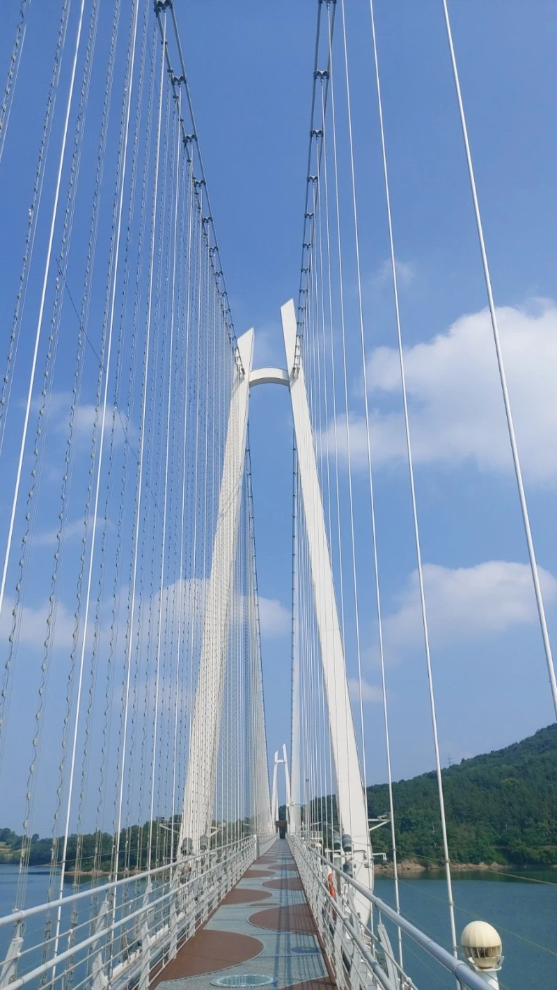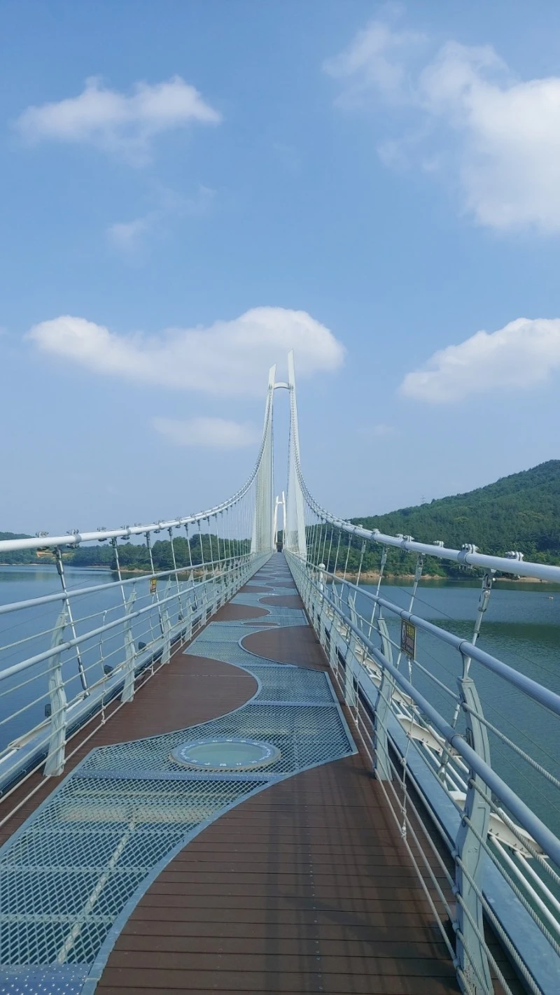 탑정호 출렁다리는 몸무게 75kg 기준 5,076명이 동시에 함께 걸을 수 있고 초속 60m 강풍에도 견딜 수 있도록 제작되서 요즘같은 장마철에도 안전하게 건널 수 있어요.