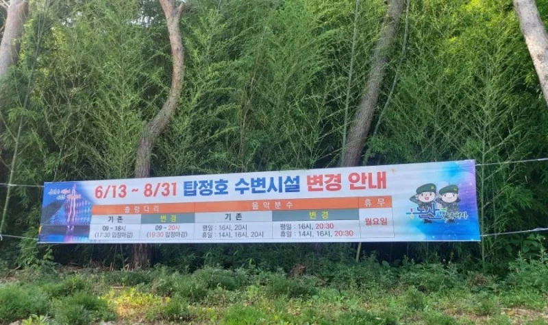 논산 탑정호 출렁다리는 2021년 7월 28일부터 무료로 시범운영하다가 2022년 3월에 입장료를 받은 이후 찾는 사람들이 급격히 줄어든 탓에 2023년 1월부터는 다시 무료입장으로 전환했답니다. 무료로 전환된 뒤 2023년 6월에 탑정호 출렁다리를 찾으니, 6월13일~ 8월 31일까지 여름시즌 한정으로 이용시간이 변경됐더라고요.