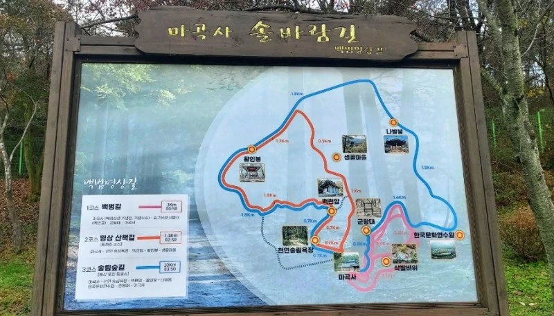 마곡사 솔바람길은 모두 3코스로 되어있어요. 그 가운데 제가 걸은 길은 1코스인 백범 김구 명상의 길이랍니다. 마곡사 입구의 주차장에서 일주문을 지나 마곡사까지 이어진 산책길이지요. 마곡사를 전체적으로 바라보기 좋은 길이기도 해요.
