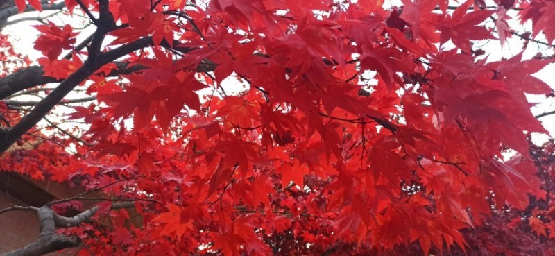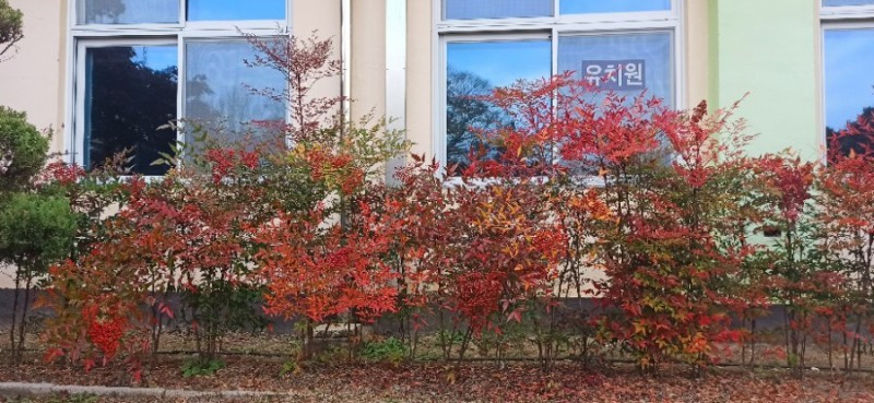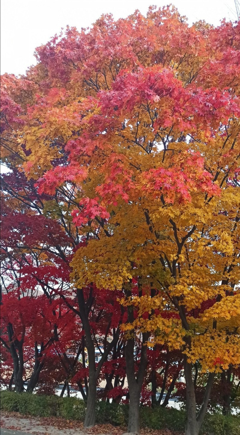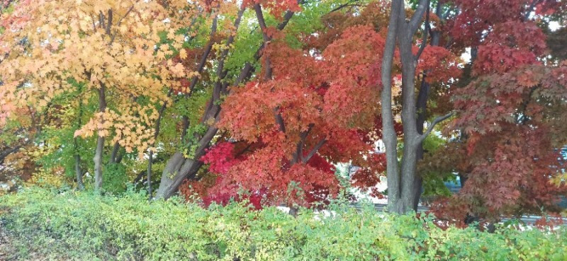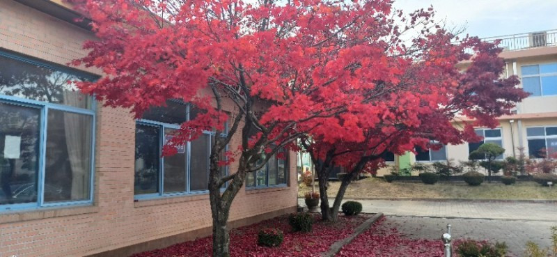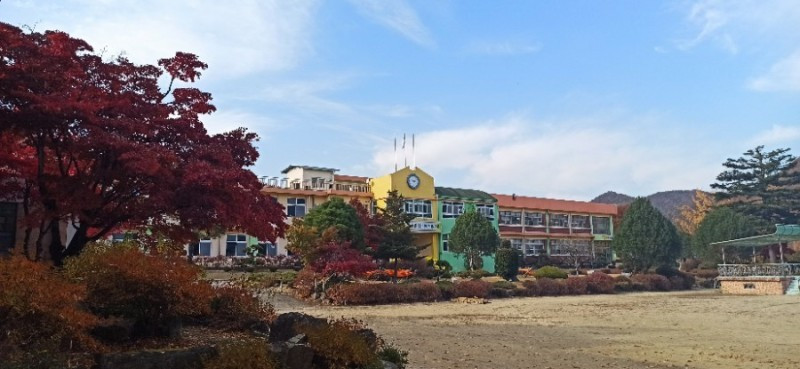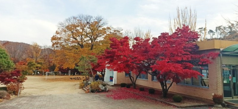 처음 찾은 곳은 청안면 백봉초등학교의 600년 된 느티나무이다. 1943년에 설립된 전교생 26명의 이 작은 학교는 들어가는 입구부터 눈부시게 황홀한 단풍들로 눈길을 사로잡았다. 교문에서 느티나무가 있는 운동장 저 끝까지 직선거리로 한 200~300m에 이르는 교정에 도열한 단풍나무들이 어찌나 예쁜지 구경하느라 한 걸음 한 걸음 떼기가 어려울 정도였다.
