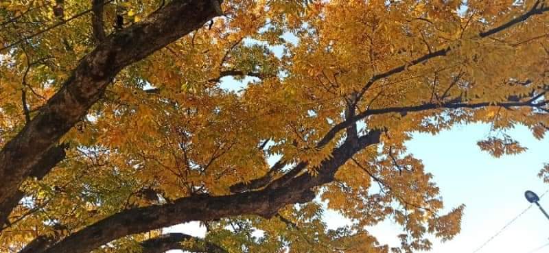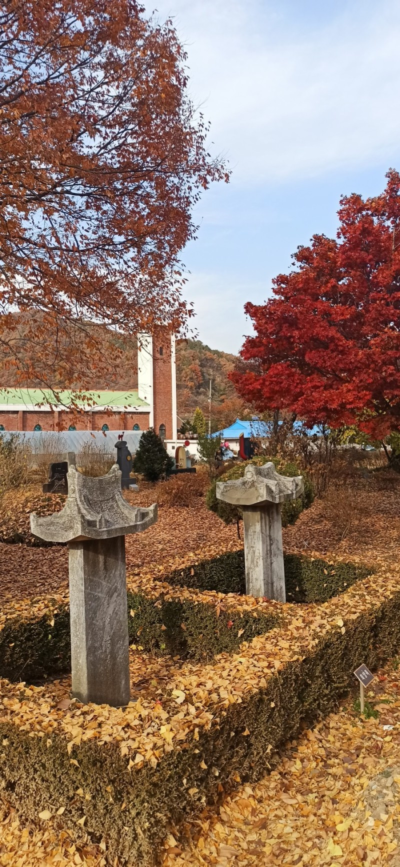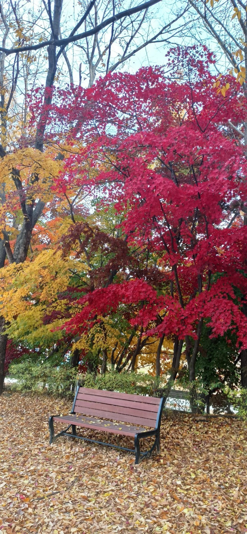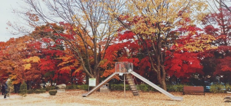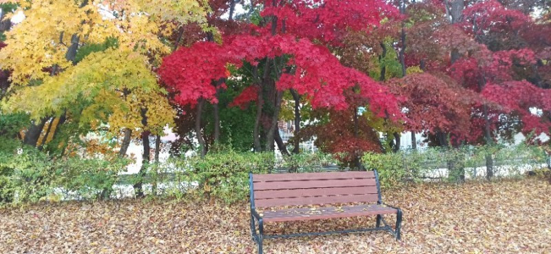 처음 찾은 곳은 청안면 백봉초등학교의 600년 된 느티나무이다. 1943년에 설립된 전교생 26명의 이 작은 학교는 들어가는 입구부터 눈부시게 황홀한 단풍들로 눈길을 사로잡았다. 교문에서 느티나무가 있는 운동장 저 끝까지 직선거리로 한 200~300m에 이르는 교정에 도열한 단풍나무들이 어찌나 예쁜지 구경하느라 한 걸음 한 걸음 떼기가 어려울 정도였다.