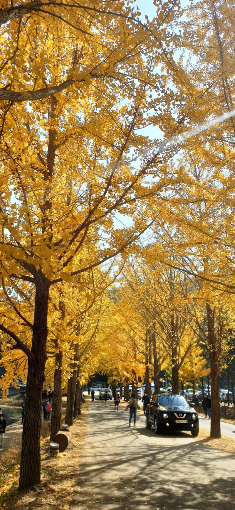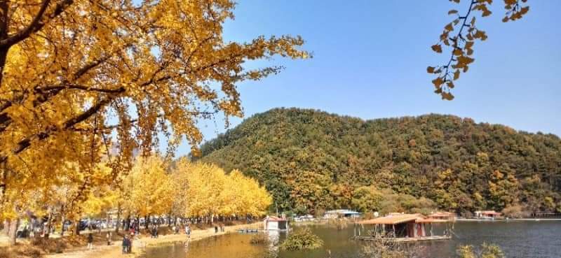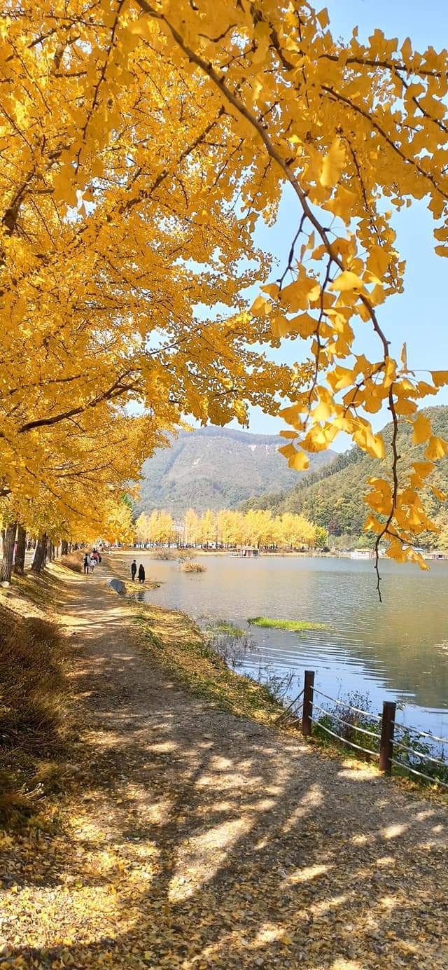 청인약방을 먼저 갈까, 청안초를 먼저 갈까 하다가 거리상 청인약방이 좀 더 가까워서 청인약방을 다음 목적지로 정했다. 가는 길에 문광저수지를 지나치게 되었는데, 지난 월요일에 들러서 실컷 은행나무길을 걸었기 때문에 이번에는 그냥 지나쳤다. 그럴 수 있어서 정말 다행이었다. 단풍철 주말이라 문광저수지를 찾은 인파가 장난 아니게 많아서, 2차선 국도의 반대편 차선이 꼬리에 꼬리를 문 차량들로 북새통이었다. 그렇게 긴 줄은 명절 때나 볼 줄 알았는데... 노란 은행나무를 보기 위해 참 많은 사람들이 문광저수지를 찾았는데 정작 은행나무잎은 거의 다 떨어져 월요일보다는 볼품이 없었다.(아래 사진은 10월 마지막 주 월요일에 찍은 문광저수지 풍경)