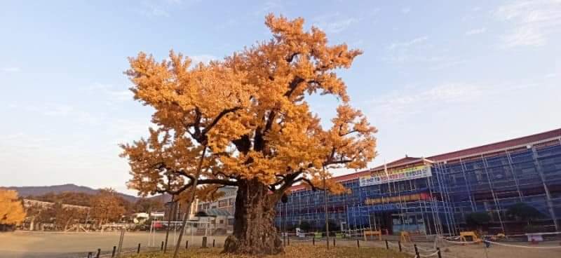 이 은행나무의 나이는 약 1,000년 정도로 추정되며, 높이 164m, 가슴 높이 둘레 7.35m이다. 줄기 곳곳에 가지가 잘린 흔적이 있고, 가지의 일부는 죽었으나 비교적 사방으로 고르게 펴져 있다. 좀 느지막한 시간에 갔더니 해는 서산으로 넘어가기 직전이라 기울어가는 햇빛을 받으며 노오란 황금빛 이파리들이 가득한 청안초 은행나무는 가히 압도적이었다. 주변을 몇 번이나 뱅글뱅글 돌면서 나무를 꼼꼼히 살피며 우러러보았다. 열매가 달린 걸로 봐선 암나무인데 아직 떨어지지 않아서 다행히 고약한 냄새는 나지 않았다. 리모델링 공사 중이라 학교건물은 차단막이 세워져 있어 백봉초에 비해 운치가 덜 했지만 천 년 세월 동안 한 자리를 지켜온 은행나무에 절로 드는 경외심이 충만했다. 이 학교 다니는 아이들은 등교할 때마다, 수업할 때면 창문으로, 운동장에서 놀 때 수시로 이 나무를 접할 수 있으니 참 행운아들이네~ 자연의 위대함을 절로 깨치겠구나~ 하는 생각이 들었다.