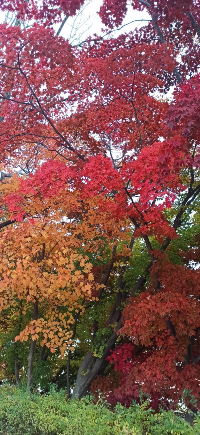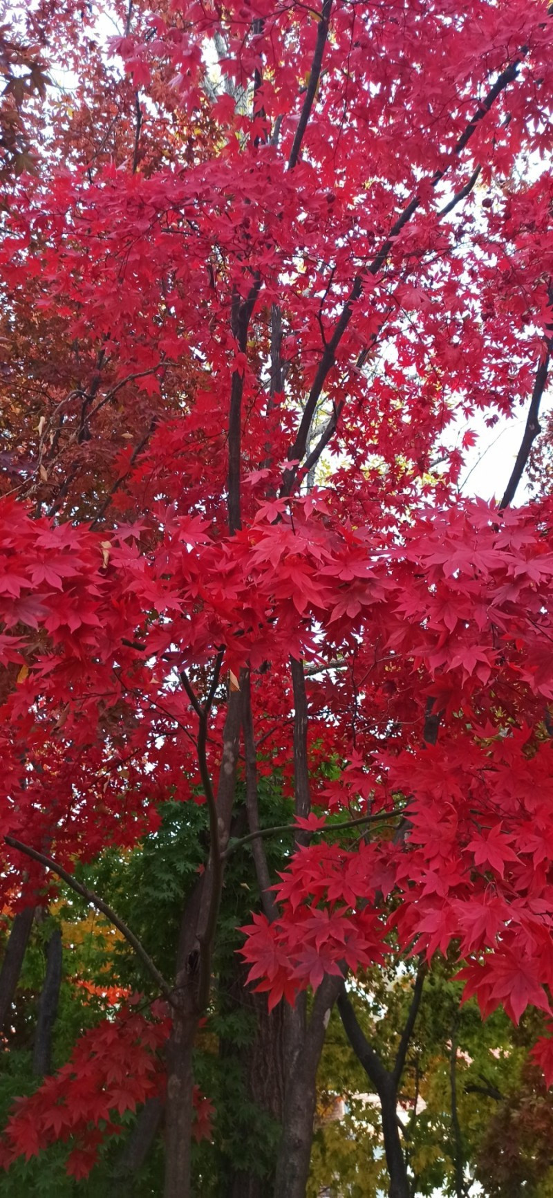 나는 괴산의 고목으로 검색을 하다가 우연히 백봉초를 알았는데, 다른 분들은 어디서 어떻게 아셨는지 예상외로 많은 사람들이 꾸준히 발걸음을 하고 있었다. 우리가 도착했을 때도 작은 시골학교 교문 입구부터 차들이 줄지어 주차되어 있어서 놀랐다. 사회적 거리두기를 못할 정도로 아주 많지는 않았지만 의외로 많은 분들이 교정 이곳저곳을 삼삼오오 단풍구경 중이었다. 단풍을 구경하면서 교정을 한 바퀴 도는 동안 600년 된 느티나무는 운동장 끝에서 수많은 가지들을 하늘 높이 뻗어 올려 파란 가을 하늘 아래 늠름한 자태를 뽐내고 있었다. 그 느티나무를 중심으로 도열한 단풍나무들의 풍경이 감탄을 절로 나게 했다.
